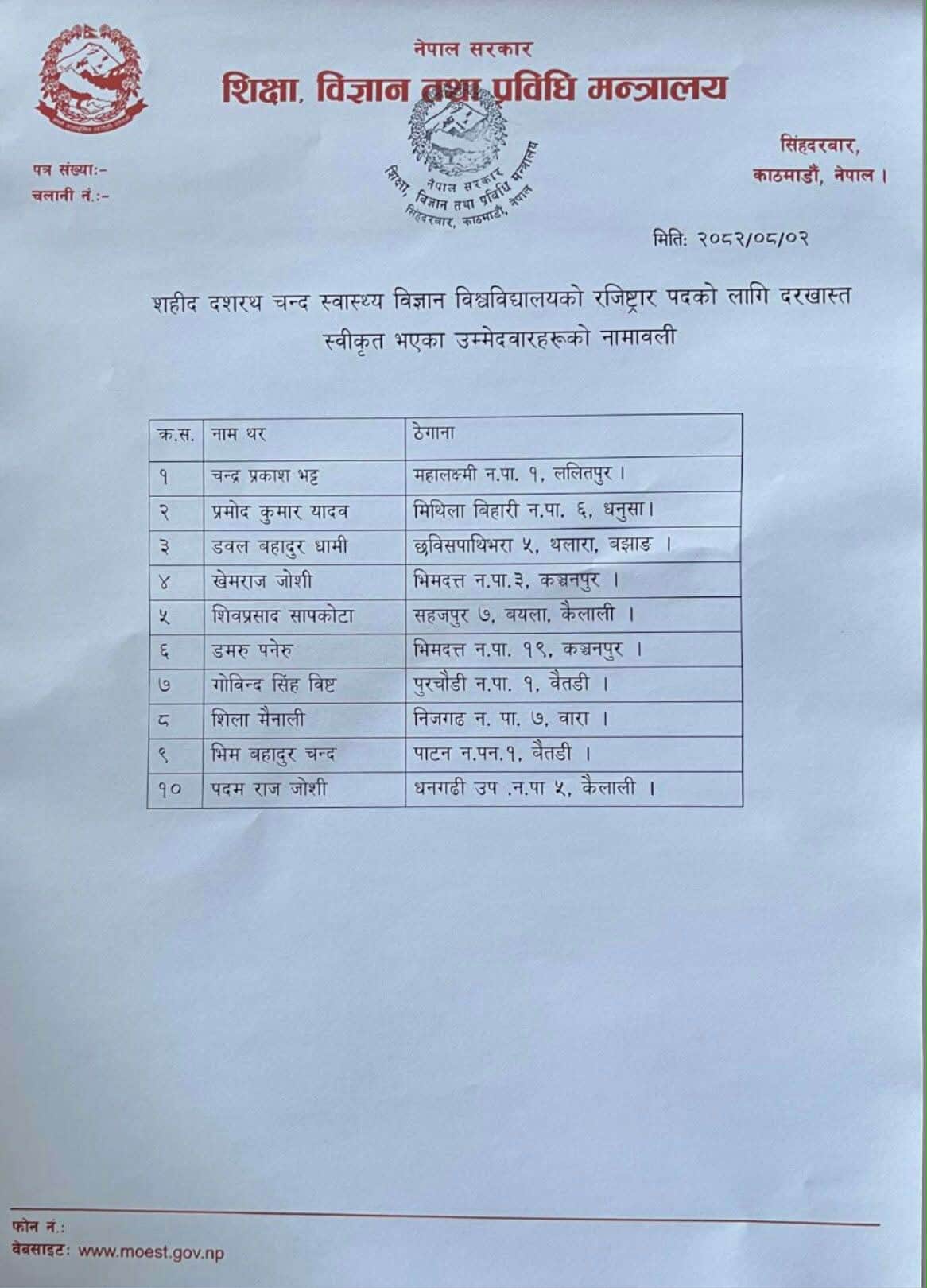 The approved applicants for the registrar position are Chandra Prakash Bhatta (Lalitpur), Pramod Kumar Yadav (Dhanusha), Double Bahadur Dhami (Bajhang), Khemraj Joshi (Kanchanpur), Shiva Prasad Sapkota (Kailali), Damaru Paneru (Kanchanpur), Govinda Singh Bista (Baitadi), Shila Mainali (Bara), Bhim Bahadur Chand (Baitadi), and Padmaraj Joshi (Kailali).