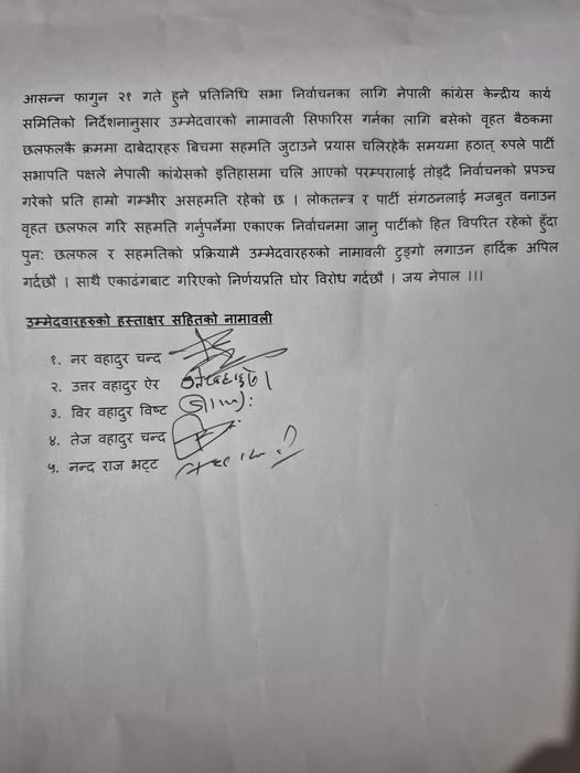 फागुन २१ गते हुने निर्वाचनका लागि बैतडीबाट नेपाली काँग्रेसका नेता नरबहादुर चन्द, उत्तरबहादुर ऐर, बिरबहादुर विष्ट, तेजबहादुर चन्द र नन्दराज भट्टले जिल्ला सभापति चन्दले योजनावद्ध रुपमा आफूलाई मात्रै सिफारिस गर्ने प्रपञ्च रचेको बताएका छन्।
