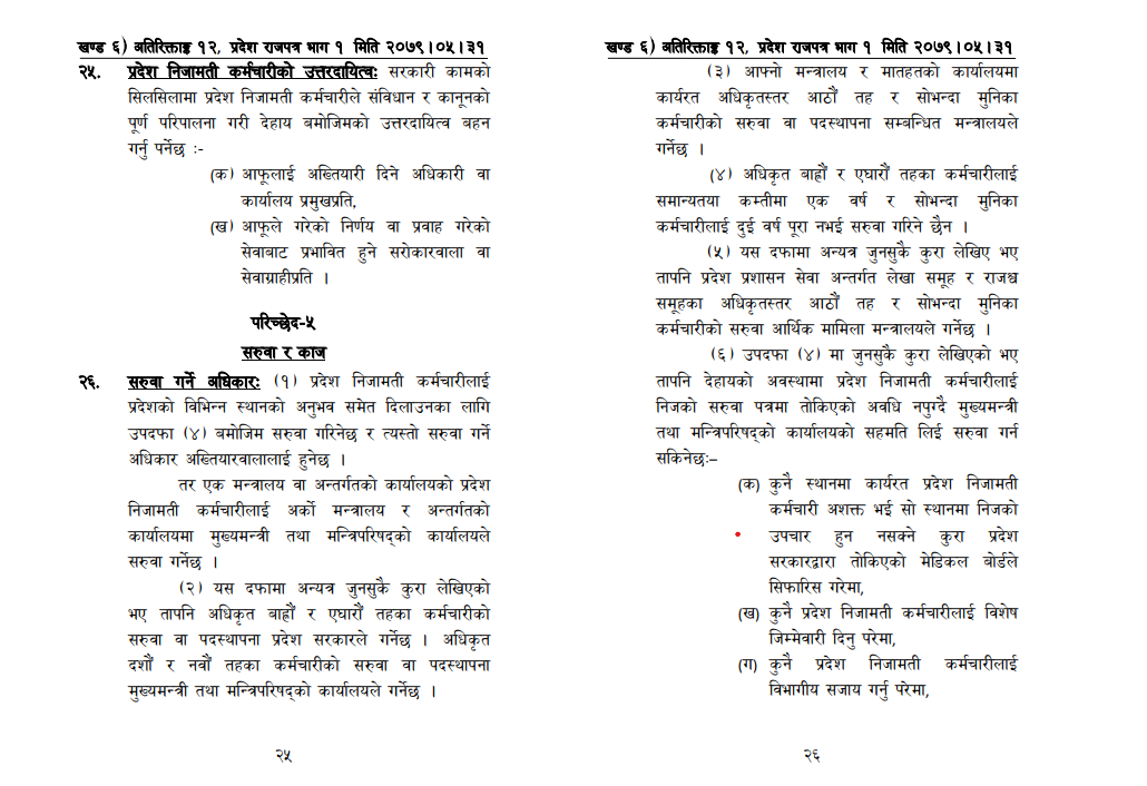 प्रदेश निजामति सेवा ऐनको दफा २६ मा सरूवा सम्बन्धी व्यवस्था छ। दफा ६ को उपदफा (४) मा 'अधिकृत १२ औं र एघारौं तहका कर्मचारीलाई सामान्यतया कम्तिमा एक वर्ष र सोभन्दा मुनिको कर्मचारीलाई दुई वर्ष पूरा नभई सरुवा गरिने छैन' भन्ने व्यवस्था छ।