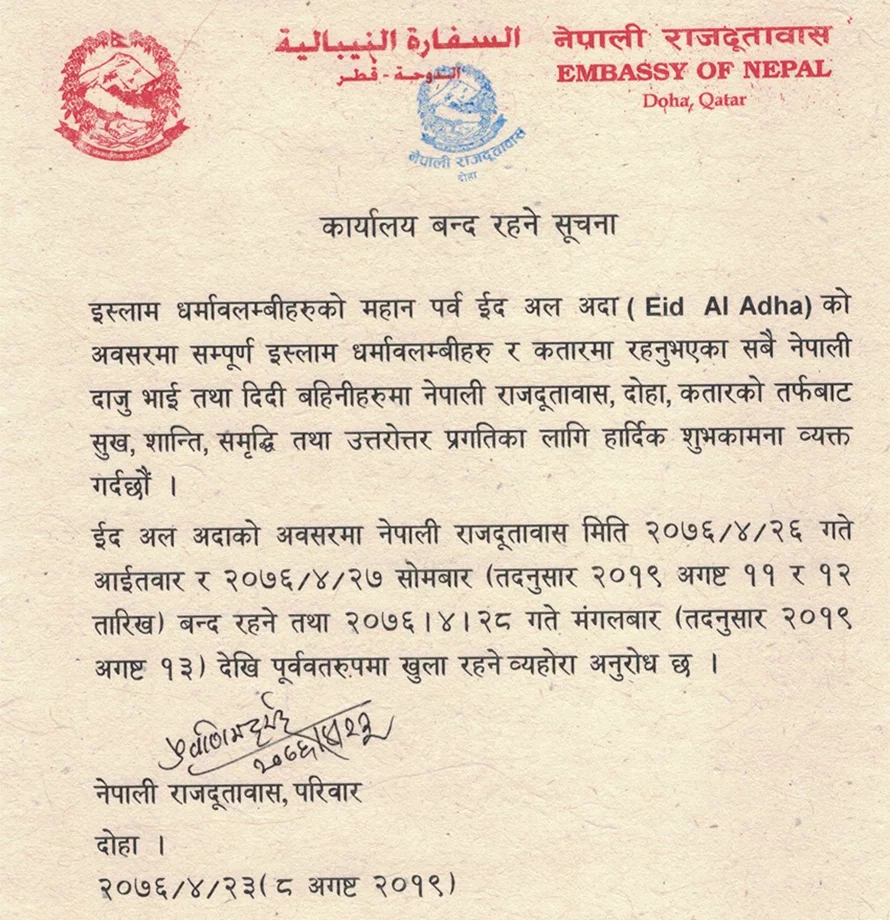 कतारको दोहास्थित नेपाली राजदूतावास दुई दिन बन्द रहने भएको छ। इस्लाम धर्मावलम्बीहरूको पर्व ईद अल अदाको अवसरमा आगामी आइतबार र सोमबार दुतावास नखुल्ने दुतावासद्वारा बिहीबार जारी विज्ञप्तिमा उल्लेख छ। ईद अल अदाको अवसरमा दुतावासले इस्लाम धर्मावलम्बी सहित सम्पूर्ण नेपालीहरूमा शुभकामना व्यक्त समेत गरेको छ।