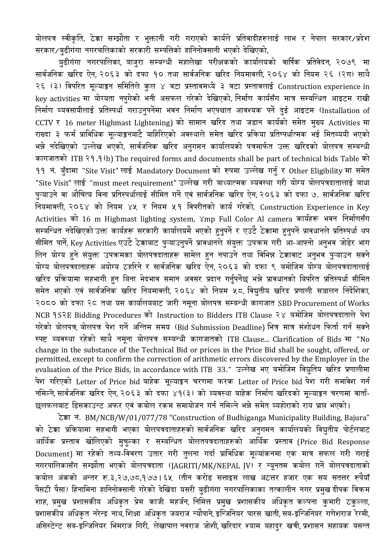 अख्तियार दुरुपयोग अनुसन्धान आयोगका अनुसार ठेक्का प्रक्रियामा सुरुदेखि नै मिलेमतो गरिएको पाइएको छ । प्रचलित कानुनविपरीत लक्षित बोलपत्रदातालाई ठेक्का दिन योग्यता शर्त तथा मापदण्ड बदनियतपूर्वक परिवर्तन गरिएको र बढी कबोल गर्ने बोलपत्रदातालाई स्वीकृत गरेर नगरपालिकालाई ठूलो आर्थिक हानी नोक्सानी पुर्याइएको आयोगको ठहर छ ।