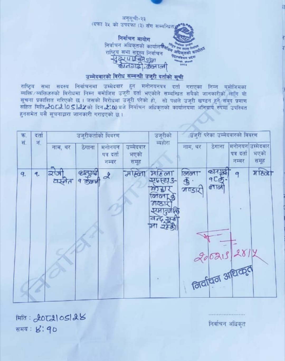 धनगढीः राष्ट्रिय सभा सदस्य निर्वाचन अन्तर्गत नेकपा एमालेकी महिला उम्मेदवार लिलाकुमारी भण्डारीविरुद्ध उजुरी दर्ता भएको छ। नेपाली कम्युनिस्ट पार्टीकी महिला उम्मेदवार रोजी बस्नेतले बिहीवार निर्वाचन आयोगको सुदूरपश्चिम प्रदेश कार्यालय धनगढीमा उजुरी दर्ता गराएकी हुन्।