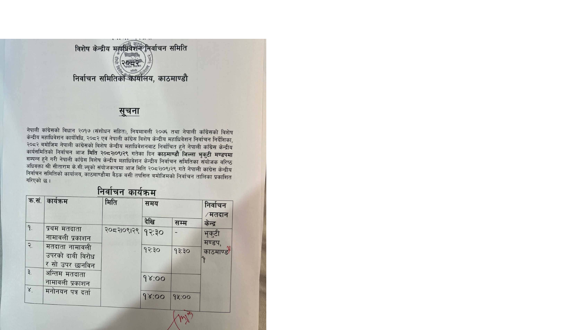 विशेष महाधिवेशनको सोमबारदेखि भृकुटीमण्डपमा जारी बन्द सत्रले आजै गठन गरेको निर्वाचन समितिले एक सूचनामार्फत कार्यतालिका सार्वजनिक गरेको हो। निर्वाचन समितिका संयोजक वरिष्ठ अधिवक्ता सीताराम केसीकाअनुसार केन्द्रीय नेतृत्व निर्वाचनका लागि आजै राति ९ बजेदेखि १ बजेसम्म मतदानको समय तोकिएको छ।