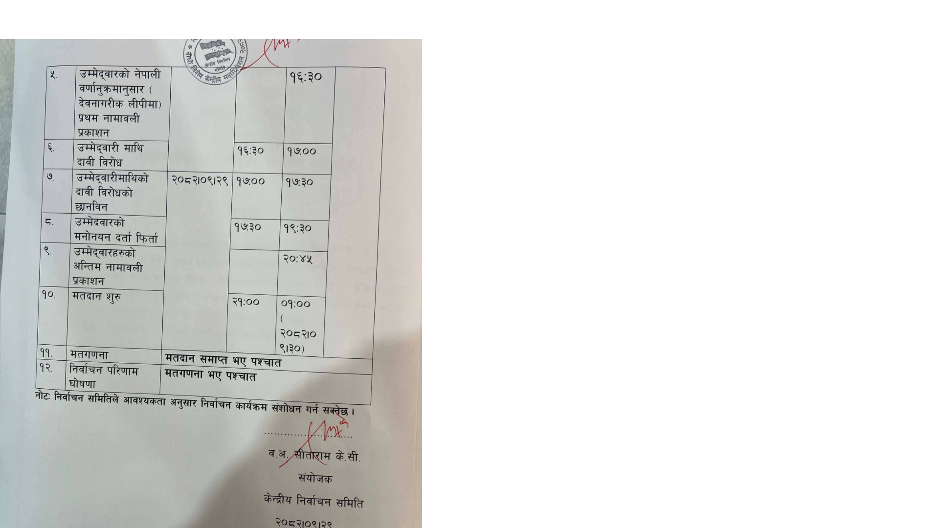 यसैगरी उम्मेदवारीमाथि दाबी विरोध साँझ ४ः३० बजेदेखि ५ बजेसम्म, उम्मेदवारीमाथि दाबी विरोध छानविन साँझ ५ देखि ५ः३० बजेसम्म, उम्मेदवारी मनोनयन फिर्ता ५ः३० देखि ७ः३० बजेसम्म र उम्मेदवारीको अन्तिम नामावली प्रकाशन ८ः४५ बजे निर्धारण गरिएको जारी सूचनामा उल्लेख छ।