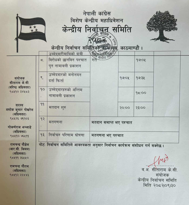 काठमाडौँः नेपाली काँग्रेसको विशेष केन्द्रीय महाधिवेशन निर्वाचन समितिले निर्वाचनका संशोधित कार्यतालिका सार्वजनिक गरेको छ।