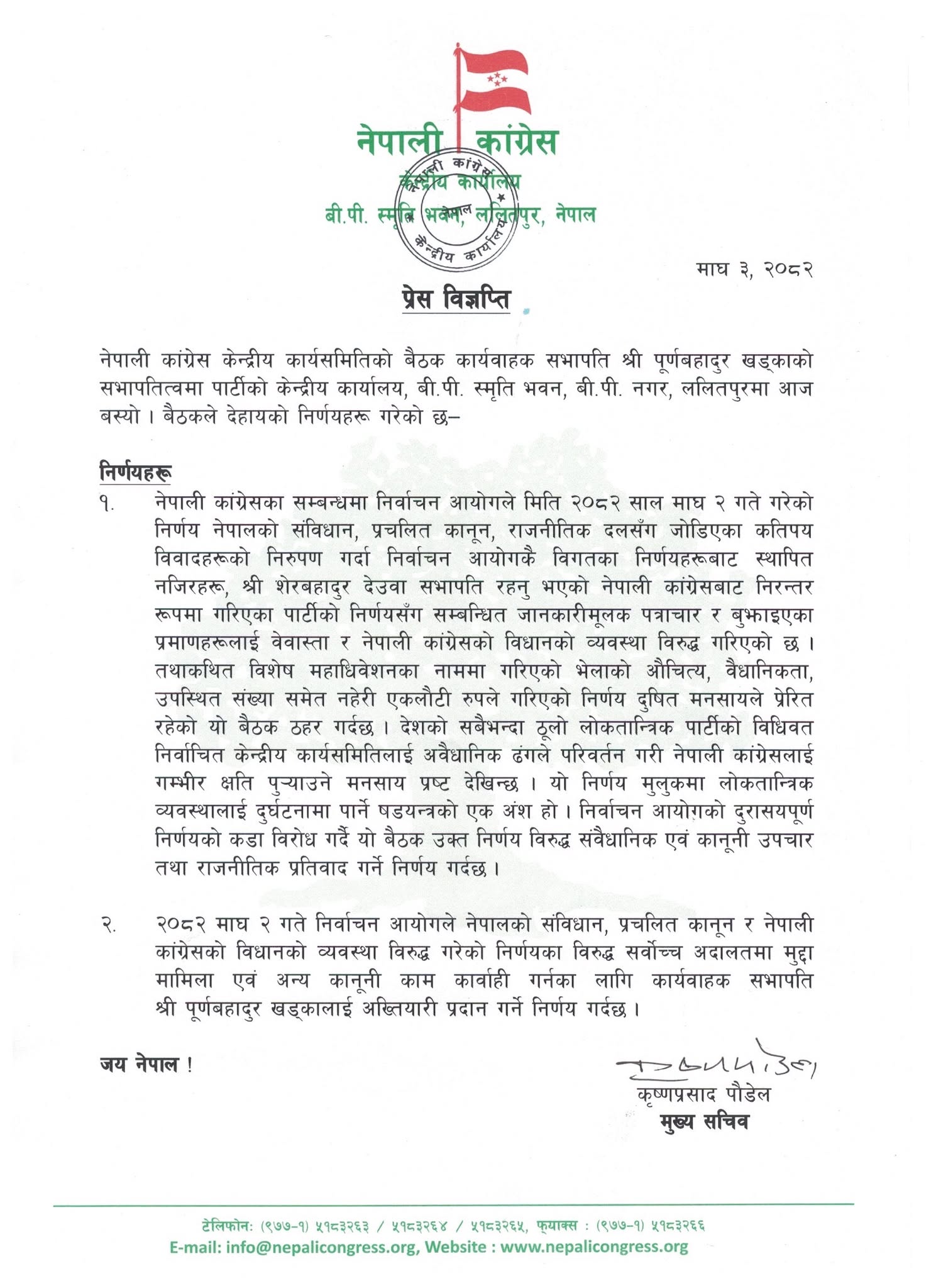 देउवा पक्षको बैठकपछि मुख्यसचिव कृष्णप्रसाद पौडेलद्वारा जारी विज्ञप्तिमा विशेष महाधिवेशनका नाममा गरिएको भेलाको औचित्य, वैधानिकता र उपस्थित संख्या समेत नहेरी आयोगले एकलौटी निर्णय गरेको आरोप लगाइएको छ। उक्त निर्णय दूषित मनसायबाट प्रेरित भएको बैठकको ठहर छ।