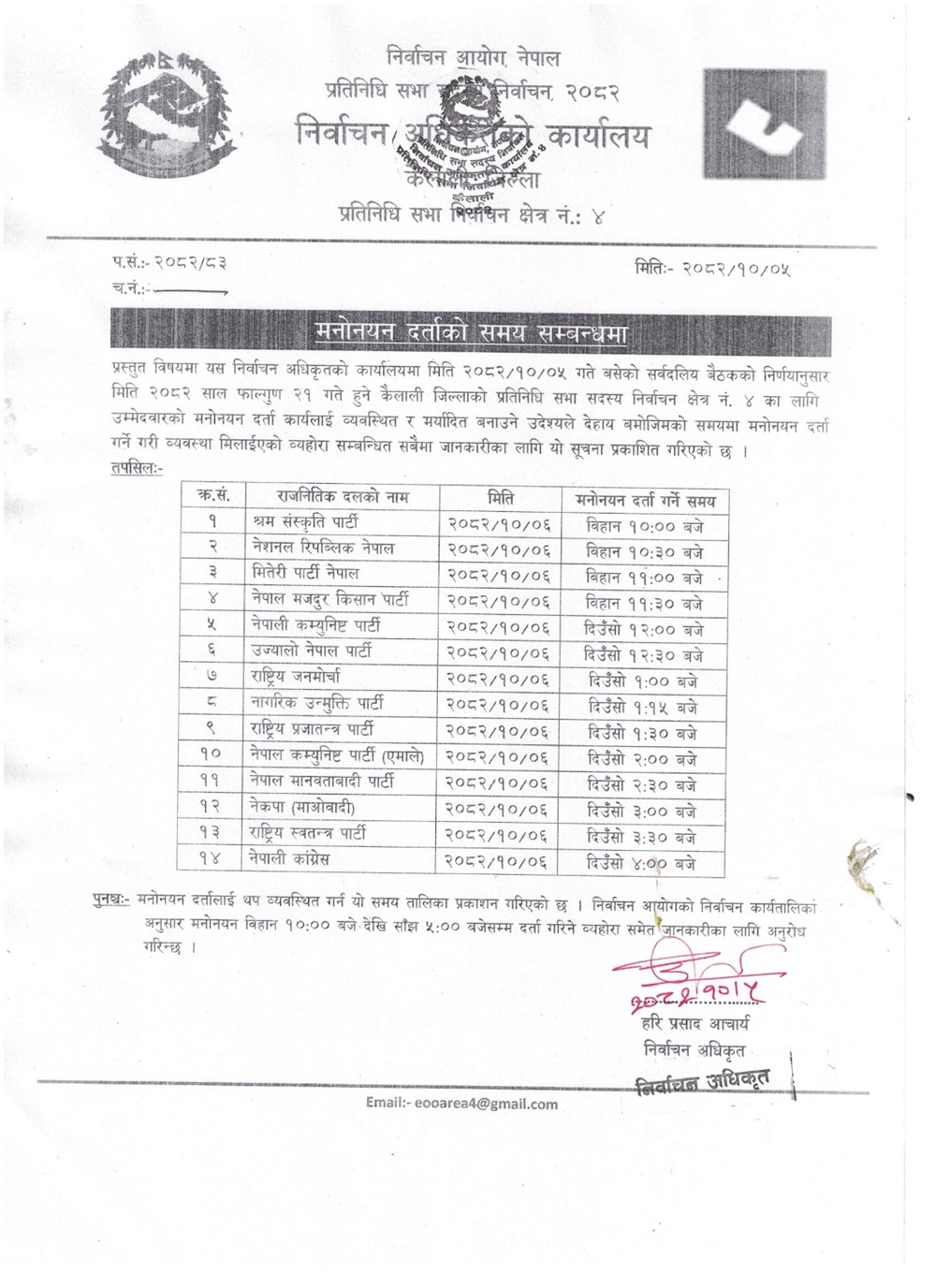 कैलाली ४ मा उम्मेदवारी मनोनयन दर्ताको लागि यस्तो छ कार्यतालिका