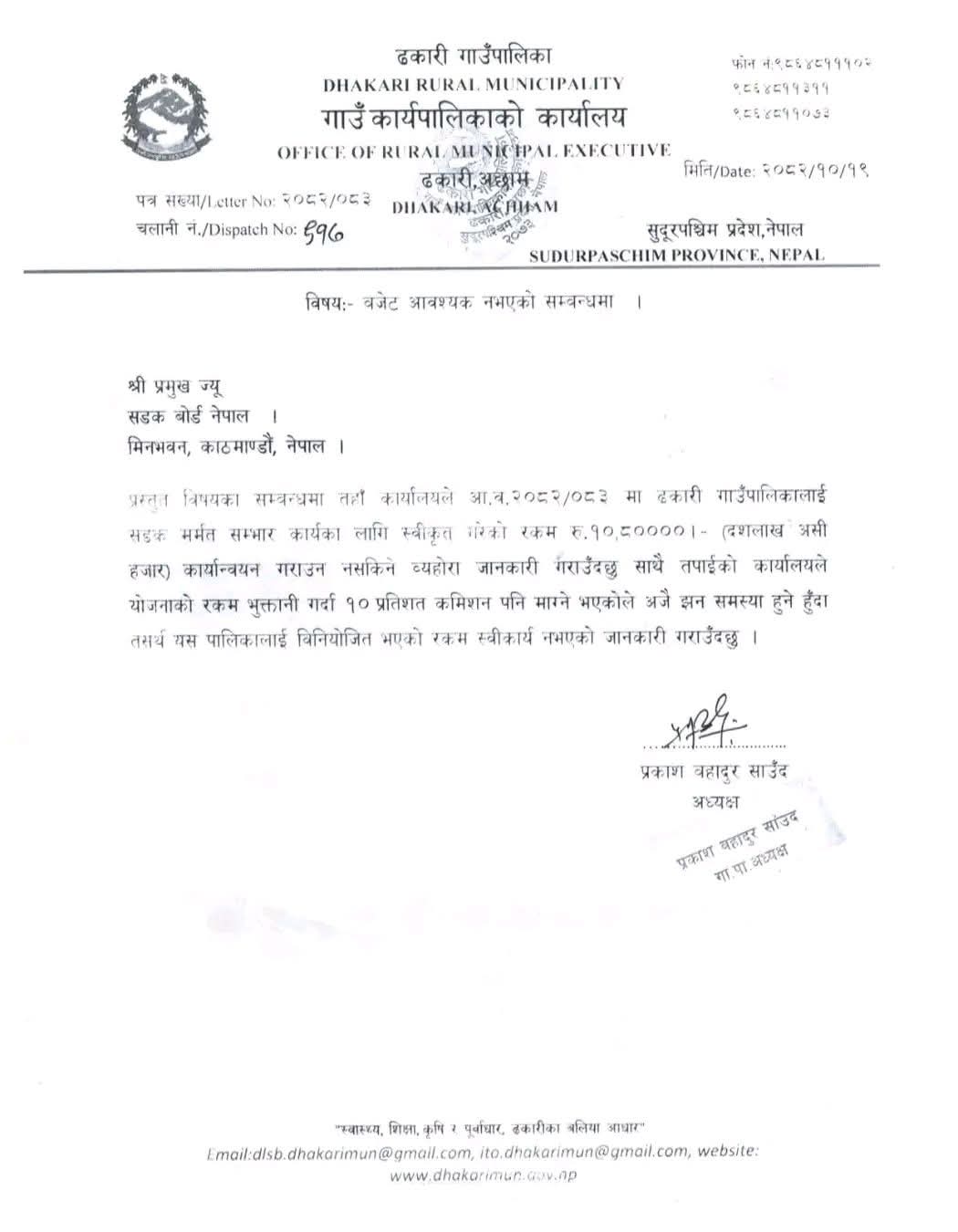 ढकारी गाउँपालिकाका अध्यक्ष प्रकाश बहादुर साउदद्वारा सडक बोर्ड नेपाललाई पठाइएको पत्रमा आर्थिक वर्ष २०८२र०८३ का लागि स्वीकृत १० लाख ८० हजार बजेट कार्यान्वयन गर्न नसकिएको जानकारी गराइएको छ। पत्रअनुसार सडक