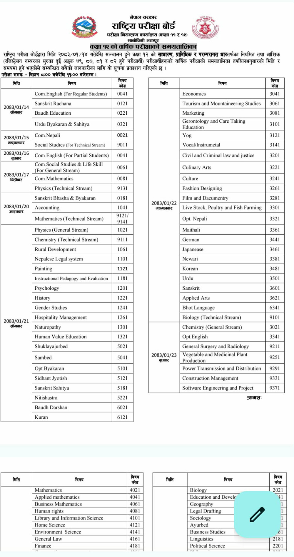 काठमाडौँः कक्षा १२ को फाइनल परीक्षा बैशाख १४ गतेदेखि हुने भएको छ।