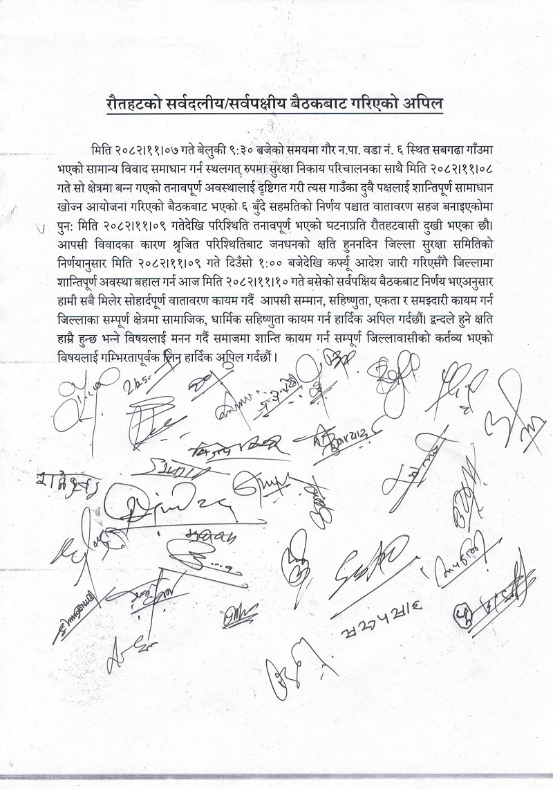 सर्वपक्षीय बैठकले शान्तिको आव्हानसहित र्याली निकाल्ने निर्णय गरे पनि रौतहटको सदरमुकाम गौर नगर क्षेत्रमा हिजोदेखि लागूभएको कर्फ्यू भने जारी छ । स्थिति अझै संवेदनशील रहेको सुरक्षा विश्लेषणका कारण तत्काल कर्फ्यू हटाउन नसकिएको प्रमुख जिल्ला अधिकारी दिनेश सागर भुसालले बताए।