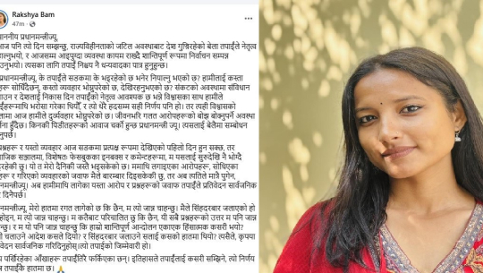 उनले शुक्रबार फेसबुकमार्फत प्रधानमन्त्री सुशीला कार्कीको ध्यानाकर्षण गराउँदै प्रतिवेदन सार्वजनिक गर्न आग्रह गरेकी हुन्। आफू र अन्य युवाहरूमाथि लागेका गम्भीर आरोपहरूको सत्यता स्पष्ट पार्न प्रतिवेदन सार्वजनिक हुनु आवश्यक रहेको उनले बताएकी छिन्।