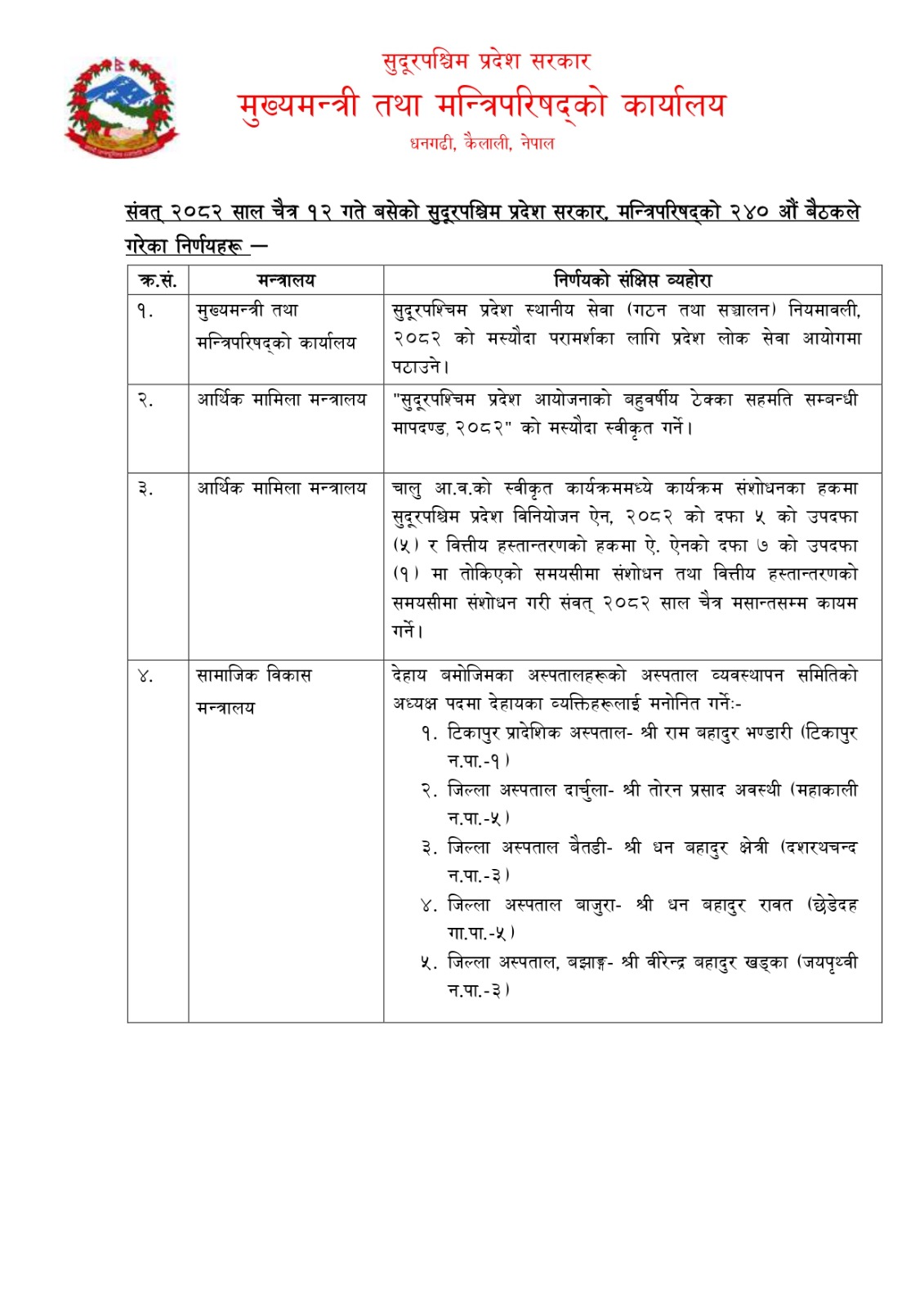 मन्त्रालयले चैत २० गते सार्वजनिक सूचना वेबसाइटमा राख्दै 'चालु आर्थिक वर्ष २०८२/८३ को स्वीकृत वार्षिक विकास कार्यक्रममा समावेश भएका कायक्रममध्ये कार्यक्रम संशोधनका हकमा सुदूरपश्चिम प्रदेश विनियोजन ऐन, २०८२ को दफा ५ को उपदफा (५) र वित्तीय हस्तान्तरणको हकमा सोही ऐनको दफा ७ को उपदफा (१) मा तोकिएको समयसीमा संशोधन गरी सम्वत् २०८२ साल चैत्र मसान्तसम्म कायम गर्ने निर्णय गरेको हुँदा सर्वसाधारणको जानकारीका लागि यो सूचना प्रकाशन गरिएको छ' भन्ने व्यहोरा सार्वजनिक गरेको छ।