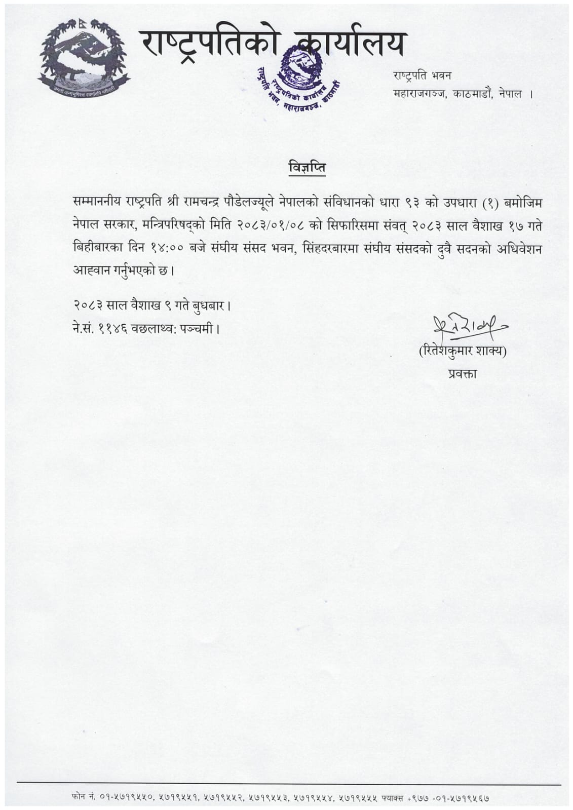 कार्यालयद्वारा जारी विज्ञप्तिअनुसार, सम्माननीय राष्ट्रपति रामचन्द्र पौडेल ले नेपालको संविधानको धारा ९३ को उपधारा (१) बमोजिम नेपाल सरकार, मन्त्रिपरिषद्को सिफारिसमा अधिवेशन बोलाएका हुन्।