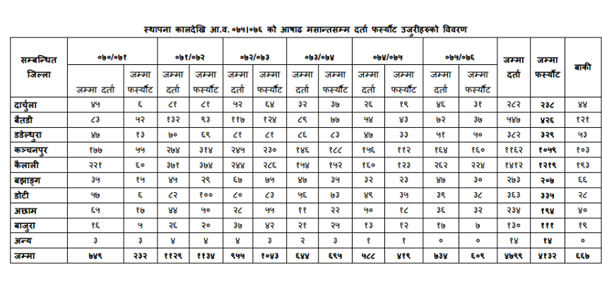 पहाडी ७ जिल्लामा सबैभन्दा बढि बैतडीका ५ सय ४७ उजुरी अख्तियारको कार्यालय कञ्चनपुरमा परेका छन्। डडेल्धुरामा तीन सय ८२, डोटीमा तीन सय ६३, दार्चुलामा दुई सय ८२, बझाङमा दुई सय ७३, अछाममा दुई सय ३४ र बाजुरामा एक सय ३० उजुरी अख्तियारमा परेका छन्।