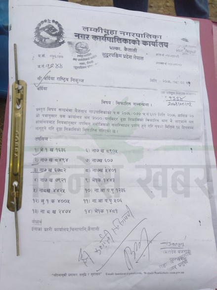 कैलालीको लम्कीचुहा नगरपालिकाले कानून मिचेर नदीजन्य वस्तुको उत्खनन् गरी निकासी गरिरहेको पाईएको छ। लम्कीचुहा नगरपालिकाका नगर प्रमुख महादेव बजगाईकै सिफारिसमा कानून विपरीत नदीजन्य वस्तु उत्खनन् गरी निकासी गरेको पाईएको हो। नगर प्रमुख बजगाईले नगरपालिकामा पेश भएको निवेदनकै आधारमा निर्माण व्यवसायीलाई नदीजन्य वस्तु उत्खनन् गरी बाँकेको बैजनाथ गाउँपालिका पठाएको दावी गरिएको छ।
