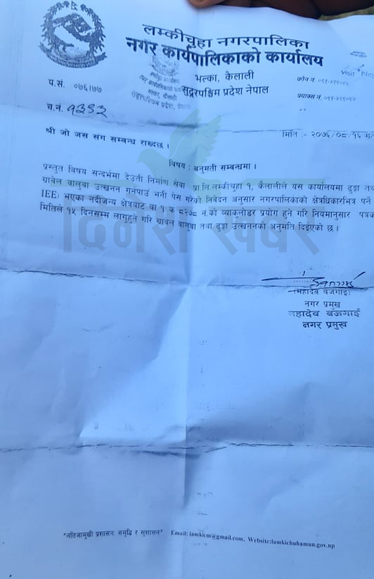 मेयर बजगाईद्धारा हस्ताक्षरित अनुमती पत्रमा भनिएको छ, ‘प्रस्तुत विषय सम्बन्धमा देउती निर्माण सेवा प्राली लम्कीचुहा नगरपालिका १ कैलालीले यस कार्यालयमा ढुङगा तथा ग्रावेल बालुवा उत्खनन् गर्न पाउन भनी पेश गरेको निवेदन अनुसार नगरपालिकाको क्षेत्राधिकार भित्र पर्ने (IEE) भएका नदीजन्य क्षेत्रबाट बा १ क ८२७८ नम्बरको भ्याकुलोडर प्रयोग हुने गरी नियमानुसार पत्रको मितिले १५ दिन सम्म लागु हुने गरी ग्रावेल वालुवा तथा ढुङ्गा उत्खनन्को अनुमती दिईएको छ।’'