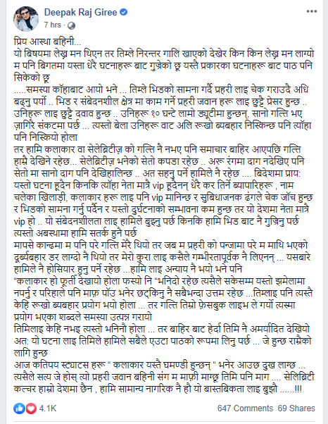 गायिका आस्था राउत र त्रिभुवन विमानस्थलको सुरक्षा जाँचमा खटिएकी महिला प्रहरी जवानबीच भएको विवाद तथा त्यसपछि उत्पन्न परिस्थितिबारे चर्चा भइरहेकै बेला कलाकार दीपकराज गिरीले फेसबुकमार्फत सुझावसहितको एक लामो ‘पत्र’ लेखेका छन्।