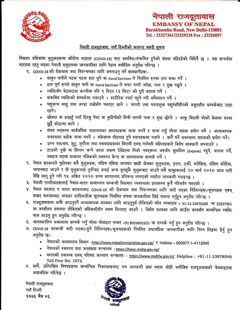 दिल्लीस्थित नेपाली दूतावासले प्रवासी नेपालीहरुलाई लक्षित गर्दै सूचना जारी गरेको छ। आज एक विज्ञप्ति जारी गर्दै दिल्लीस्थित दूतावासले कोरोना महामारीबाट बच्न अप्नाउने उपायसहित सूचना जारी गरेको हो।