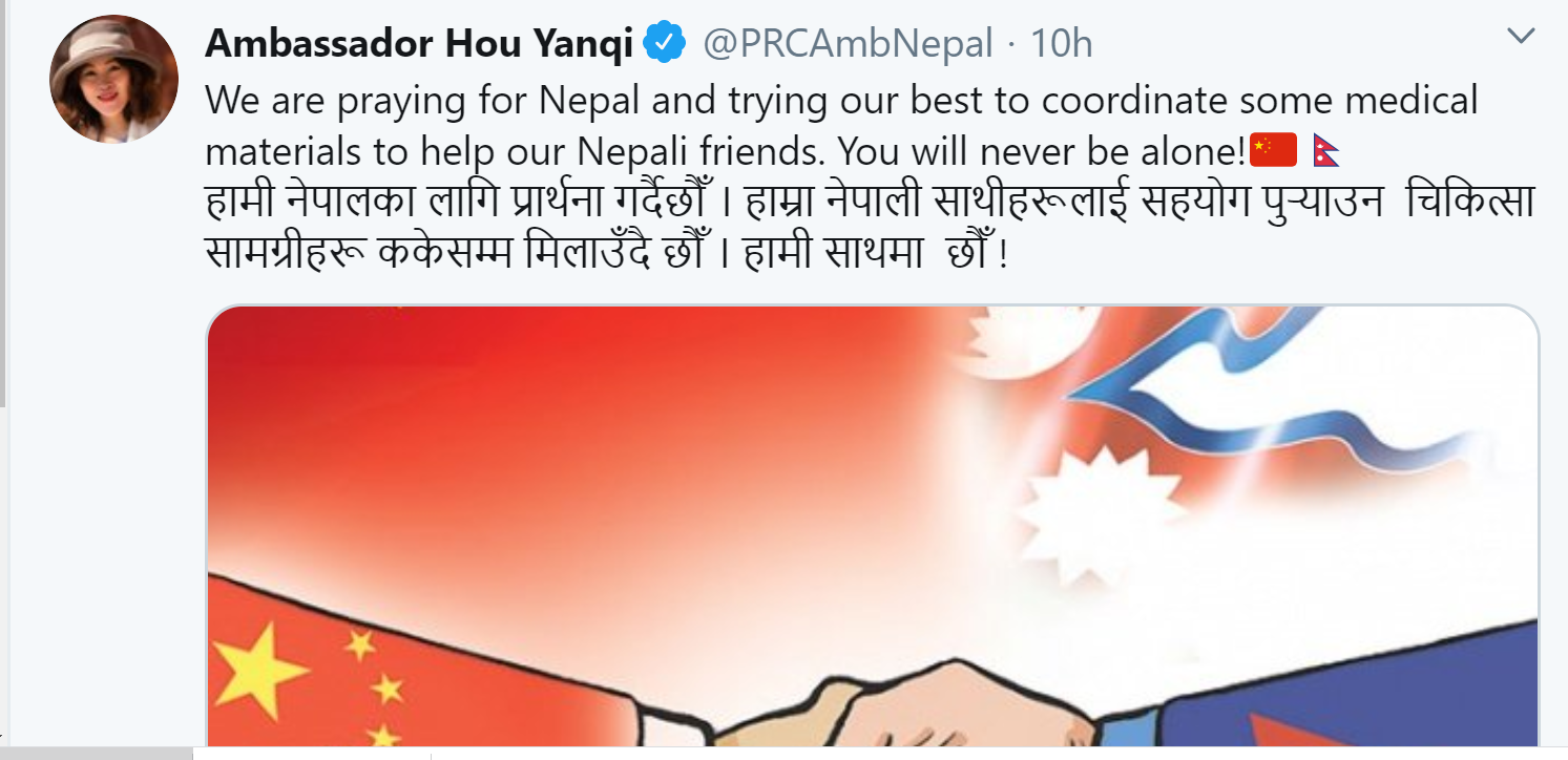 नेपालका लागि चिनियाँ राजदूत होउ यान्कीले सामाजिक सञ्जाल ट्विटरमार्फत नेपाललाई चीनको बलियो साथ रहेको बताएकी छिन्। सरकारले नेपाललाई एक साताका लागि लकडाउन गरेका बेला उनको नयाँ भनाई आएको हो। उनले ट्विटरमा लेखेकि छिन्, ’हामी नेपालका लागि प्रार्थना गर्दैछौं’, हामी नेपालका साथीहरुलाई सहयोग र्पुयाउन तत्पर छौं। चिकित्सा सामाग्रीहरु सकेसम्म मिलाउँदैछौं, हामी साथमा छौं।’