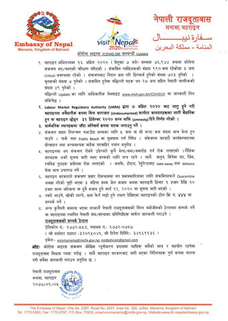 त्यहाँ रहेको नेपाली दूतावासले थप २७ जनामा संक्रमण देखिएको पुष्टि गरेको छ। बहराइनमा अहिलेसम्म ९९० जनामा संक्रमण देखिएको छ। उनीहरु मध्ये ७ जनाको मृत्यु छ । तीन जनाको अवस्था गम्भीर छ भने सात सय तीन जना निको भएका छन्।