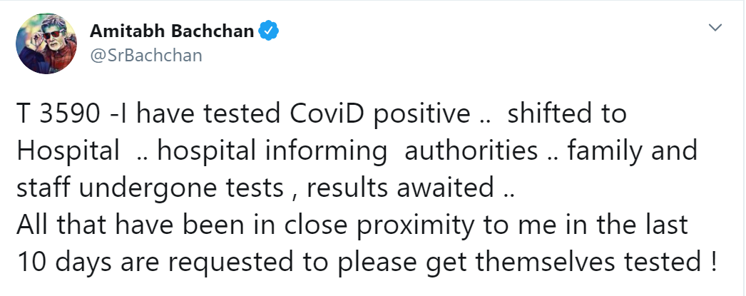 भारतीय चलचित्र उद्योग (बलिउड)का महानायक अमिताभ बच्चनलाई कोरोना पोजिटिभ देखिएको छ। कोरोना पोजिटिभ देखिएपछि उनलाई मुम्बईको नानावटी अस्पतालमा भर्ना गरिएको छ।