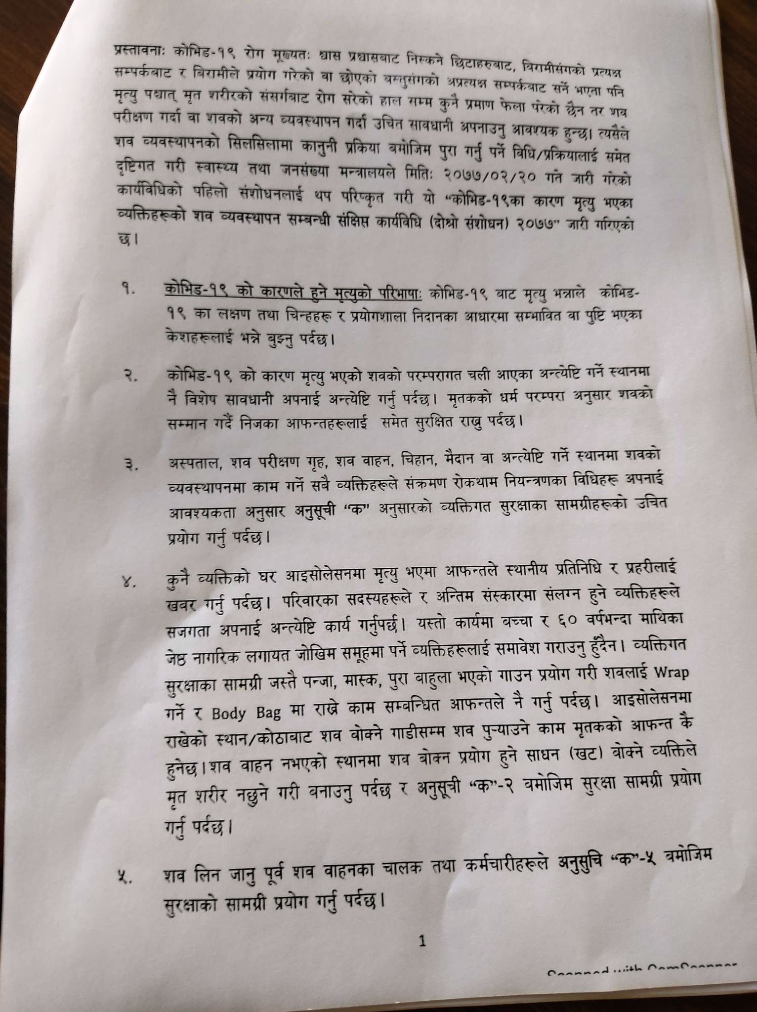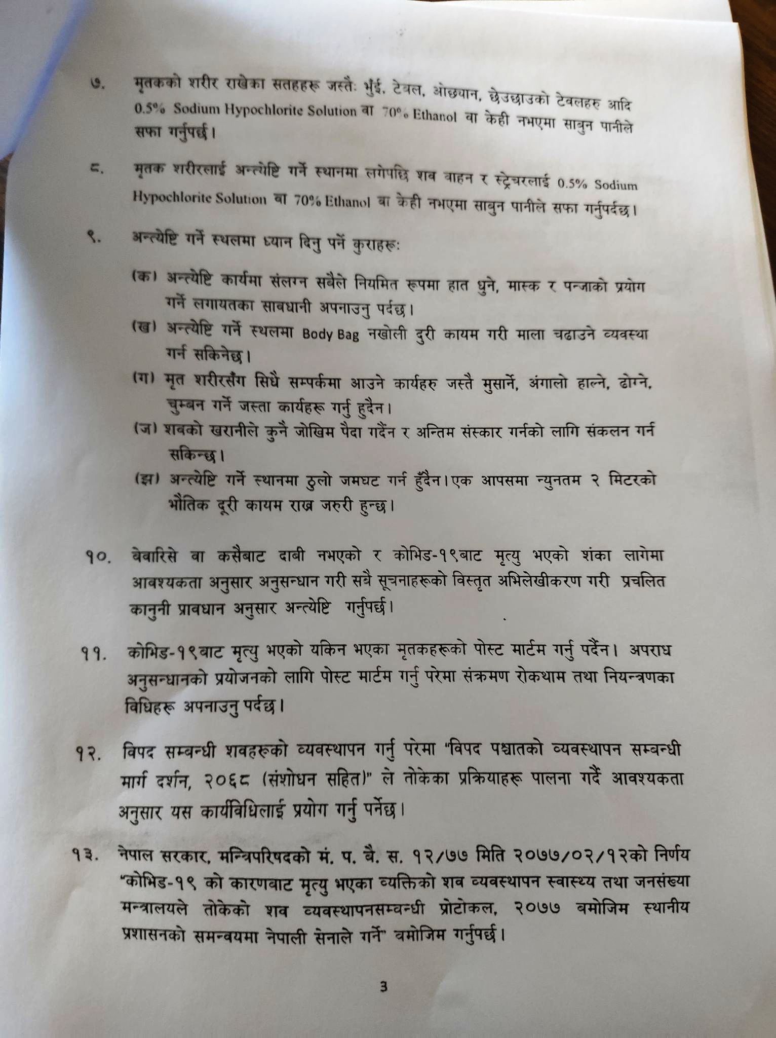 कार्यविधिको दोस्रो बुँदामा उल्लेख छ, ‘कोभिड १९ को कारण मृत्यु भएको शवको परम्परागत चली आएको अन्त्येष्टि गर्ने स्थानमा नै विशेष सावधानी अप्नाई अन्त्येष्टि गर्नु पर्दछ । मृतकको धर्म परम्परा अनुसार शवको सम्मान गर्दै निजको आफन्तलाई समेत सुरक्षित राख्नु पर्दछ ।’