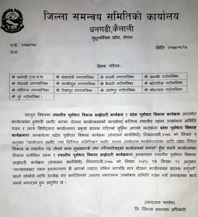 जिल्ला समन्वय समितिले सबै स्थानीय तहलाई विघटित प्रतिनिसभा सदस्यको स्थानीय पूर्वाधार विकास साझेदारी कार्यक्रम र प्रदेशसभा सदस्यको प्रदेश पूर्वाधार विकास कार्यक्रम अन्तरगत छनोट भएका योजना कार्यान्वयनको सन्दर्भम अर्को सूचना जारी नभएसम्म उपभोक्ता समिति गठन नगर्न भनी परिपत्र गरिएको हो।