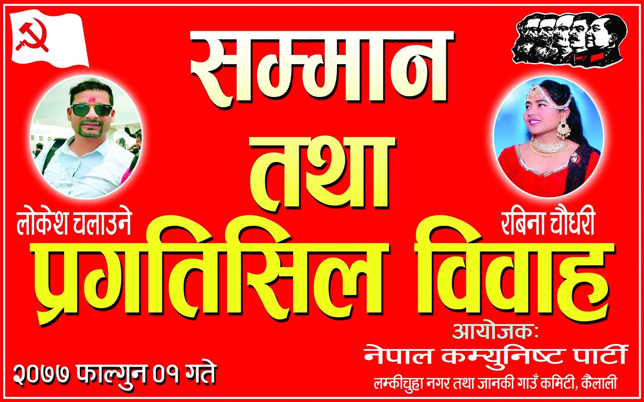 सरकारद्वारा प्रतिबन्धित नेत्रविक्रम चन्द (विप्लव) नेतृत्वको नेकपामा आवद्ध ती लाल जोडी जनयुद्ध दिवसको अवसर पारेर फागुन १ गते जनवादी विवाह गरेका हुन्।