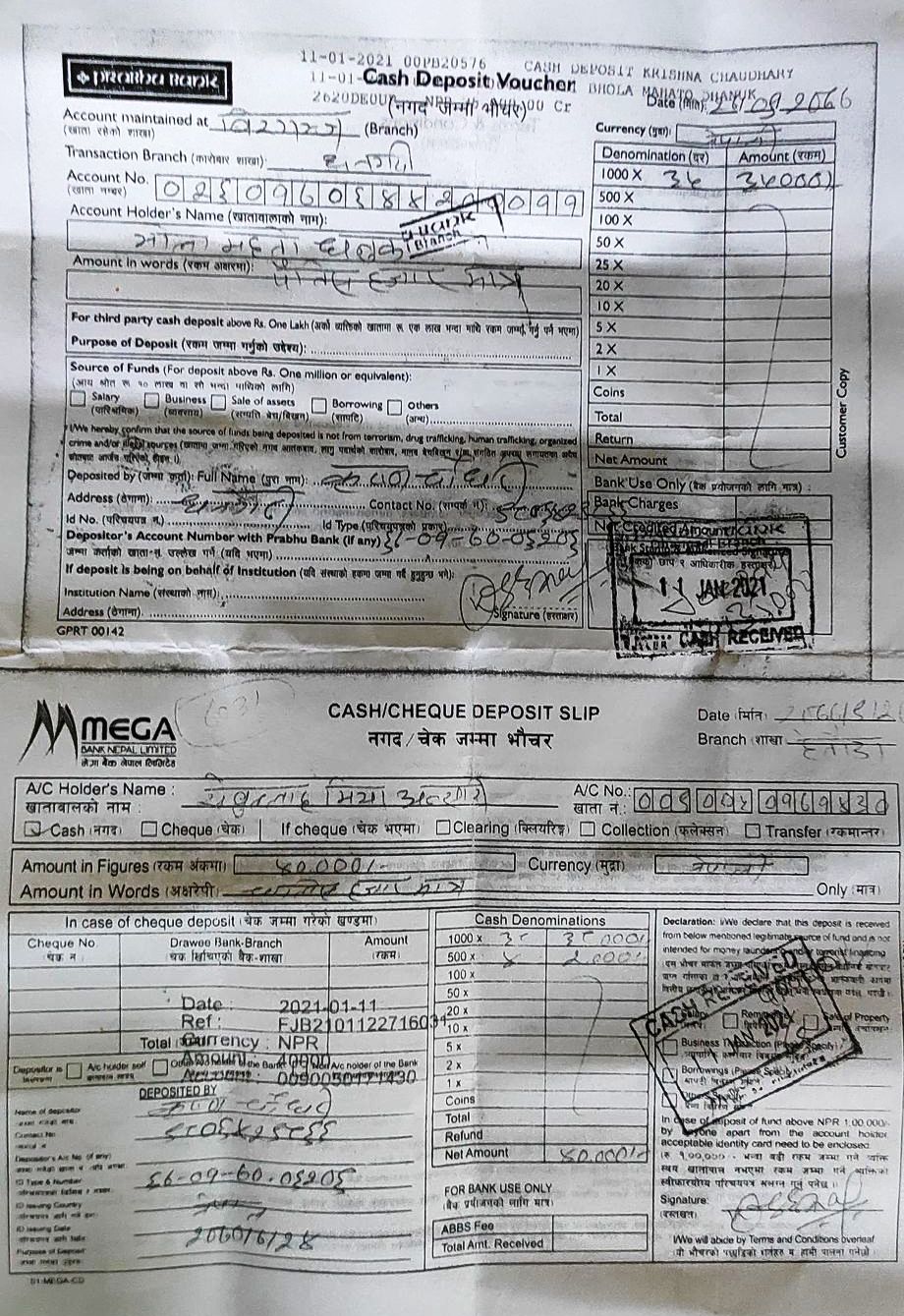 त्यहि अनुसार कृष्ण चौधरीले भोला महतोलाई विरगञ्जमा ३५ हजार आइएमइमार्फत पठाए। त्यसैगरी सेबुल्ला मिया अन्सारीको मेघा बैंकको खाता नम्बरमा ४० हजार नगद जम्मा गरे।