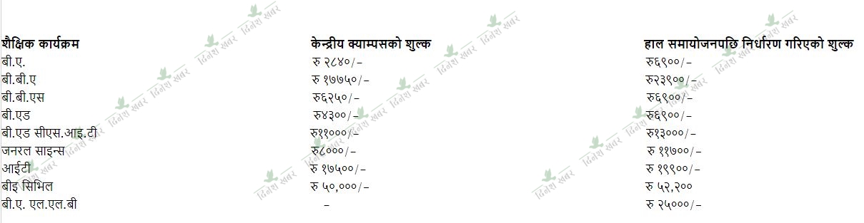 धनगढीः कैलाली बहुमुखी क्याम्पसमा बीबीए अध्ययनरत विद्यार्थी ४ लाख ३० हजार रुपैयाँ शैक्षिक शुल्क तिर्दै आएका थिए। यो कैलाली बहुमुखी क्याम्पस सुदूरपश्चिमाञ्चल विश्वविद्यालयको आंगिक क्याम्पस बन्नुअघि विद्यार्थीले तिरिरहेको शुल्क हो।
