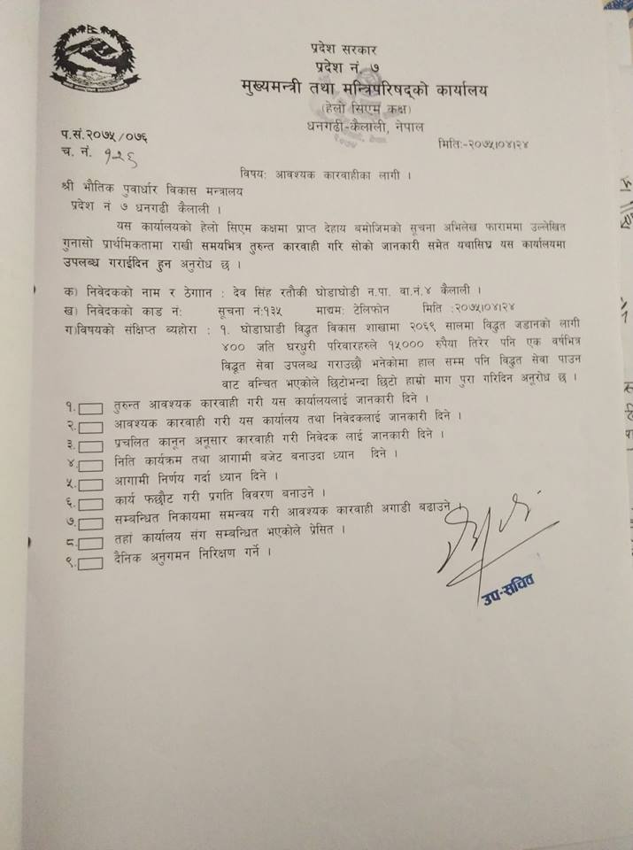 तर कर्मचारीले गर्ने गुनासा भने प्रदेश सरकारले फटाफट सम्बोधन गरिरहेको छ। भौतिक पूर्वाधार विकास मन्त्रालयका नायब सुब्बा रामचन्द्र भट्टले प्राप्त ५४ वटा गुनासा मध्ये सरकारी कर्मचारीसँग सम्बन्धीत र अन्य गरी चार वटा मात्रै सम्बोधन भएको जानकारी दिए। विकास निर्माणसँग सम्बन्धीत गुनासाका विषयमा पनि सम्बन्धीत कार्यालयलाई जवाफ माग सहित समाधान गर्न पत्राचार गरिएको दावी मन्त्रालयले गरेको छ। तर जवाफ नआएपछि दोस्रो पटक पत्राचार भने गरेको छैन्। यता प्रदेशको समाजिक विकास मन्त्रालयले मुख्यमन्त्री कार्यालयबाट कार्यान्वयन गर्न भनि आएका केहि गुनासा सम्बोधन भइसकेको दावी गरेको छ।
