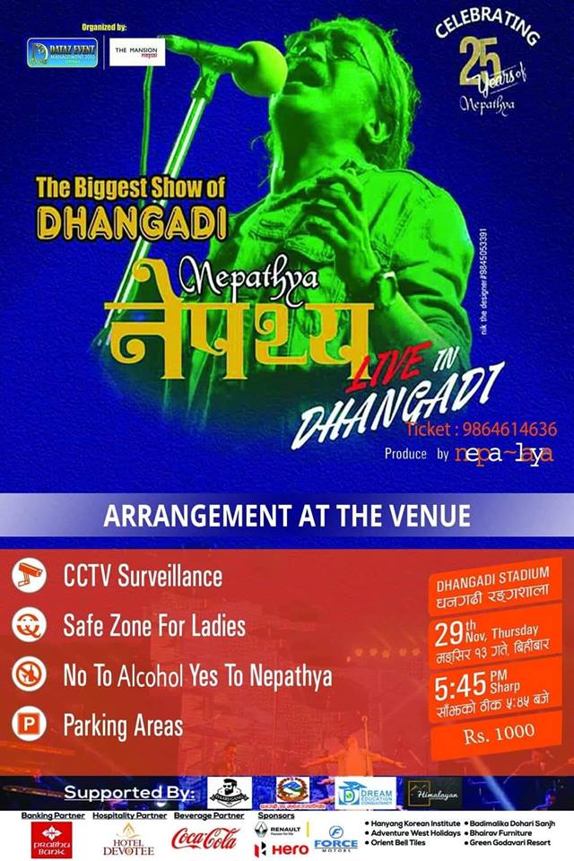 दाताज ईभेन्ट म्यानेजमेन्ट चितवन र द मेन्सन नेपाल धनगढीको संयुक्त आयोजना तथा दाह्ी ग्याङ धनगढीको सहयोगमा बिहीबार साँझ ५ः४५ बजे देखि ३ घण्टा हुने कन्सर्टको तयारी अन्तिम चरणमा पुगेको छ । नेपथ्यको प्रस्तुती धनगढीमा आठ बर्षपछि हुन लागेको हो । सो कन्सर्टमा ६ हजार दर्शकहरुको सहभागीता रहने आयोजक दाताज ईभेन्ट म्यानेजमेन्ट चितवनका प्रमुख दाताराम घिमिरेले बताए ।