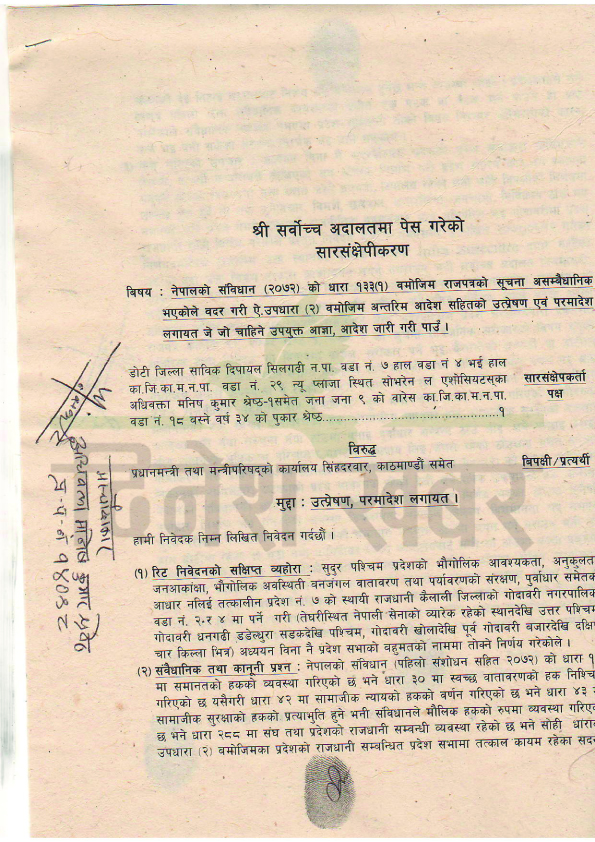 सुदूरपश्चिम प्रदेशको राजधानी गोदावरीमा उपयुक्त नहुने भन्दै सर्वोच्च अदालतमा अर्को रिट दर्ता भएको छ। सर्बोच्च अदालतमा डोटी घर भएका अधिबक्ता मनिस कुमार श्रेष्ठ सहित पुकार श्रेष्ठ लगायत ९ जनाले प्रदेशको राजधानी तोक्दा अबैज्ञानिक र असंबैधानिक तरिकाले तोकिएको भन्दै रिट दर्ता गराएका हुन्। स्थानीय तहको वडा निर्धारण गर्दा विभिन्न क्षेत्रको अध्ययन अनुसन्धान गरिने तर राजधानी जस्तो गम्भिर विषयमा अध्ययन नै नगरि तोकिएपछि अदालत जान परेको अधिवक्ता श्रेष्ठले बताए। राधजानीको विषयमा सधै सुदूरपश्चिमवासी विभाजन हुनुपर्ने अवस्था श्रृजना भईरहेकाले राजधानी ताक्ेदा ईतिहास, राजनीतिक महत्व, भुगोल, पर्यावरण, जनताको भावना, संरचना, सामरीक महत्वका विषयमा अध्ययन हुनुपर्ने तर्क उनको छ। उनले दुई तिहाईको निर्णय अनुसार राजधानी निर्धारण भएकाले अदालमा रिट हाल्न समेत निकै समस्या खेप्नु परेको बताए। १५ दिनको प्रयास पछि आज रिट दर्ता गरिएको अधिवक्ता श्रेष्ठले बताए।