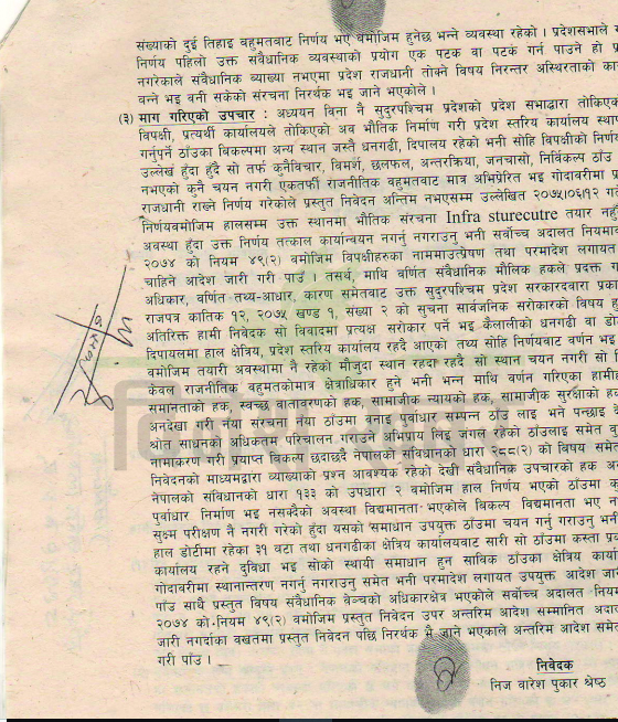 प्रधानमन्त्री तथा मन्त्री परिषद्को कार्यालयलाई विपक्षी बनाएर दर्ता गरिएको रिटमा राजधानीको निर्णय कार्यान्वन नगराउन परमादेशको माग गरिएको छ।