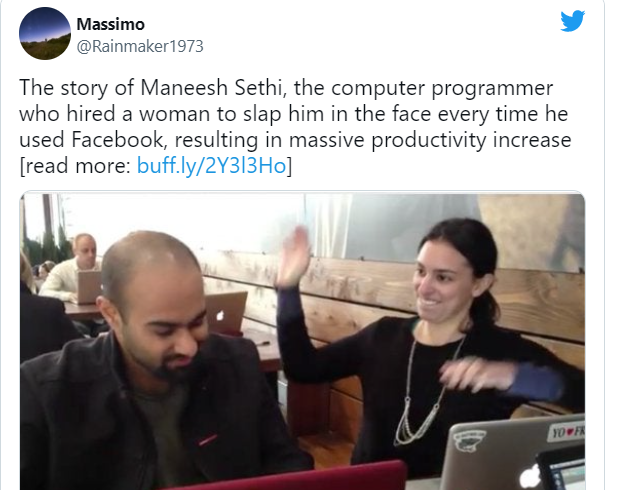 वास्तवमा, भारतीय–अमेरिकी उद्यमी मनिष सेठीले फेसबुक खोल्दा हरेक पटक उनलाई थप्पड हान्नका लागि एक महिलालाई जागिरमा राखेका हुन्। लगाउन योग्य उपकरणको ब्रान्ड पावलोकका संस्थापक सेठीले कारा नामकी एक महिलालाई उनको स्क्रिन हेर्न र सोसल मिडिया प्लेटफर्ममा गएको खण्डमा उनलाई थप्पड हान्नका लागि ८ डलर प्रति घण्टाका लागि काममा राखे।
