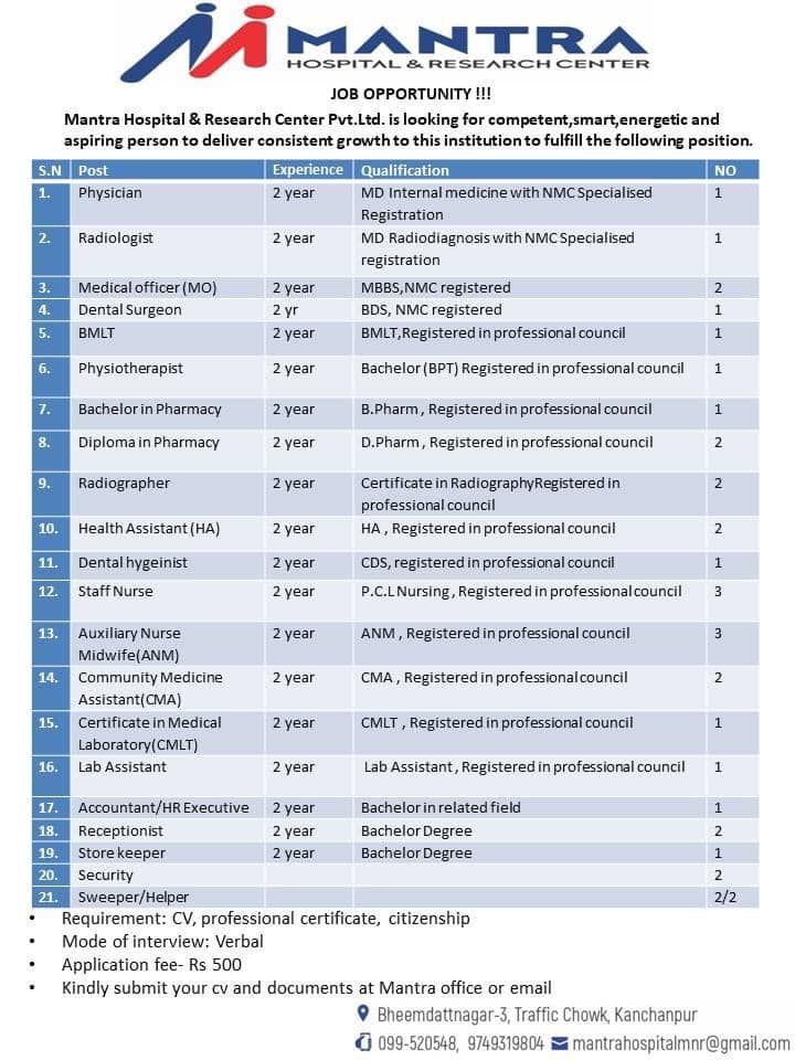 धनगढी: कञ्चनपुरको महेन्द्रनगरमा सञ्चालन हुने मन्त्र अस्पतालले ठूलो संख्यामा कर्मचारी माग गरेको छ। अस्पतालले एमडी फिजिसियन, मेडिकल अफिसरदेखि हेल्परसम्मका ३५ जना कर्मचारी माग गरेको हो।