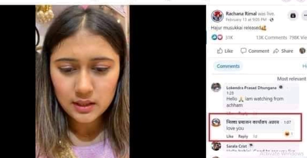 यसअघि पनि जिल्ला प्रशासन कार्यालय अछामको आधिकारिक फेसबुक अकाउन्ट विवादित नबनेको भने होइन। बेलाबखतमा चर्चा र विवादमा आइरहने उक्त फेसबुक अकाउन्टको चर्चा पुनः एकपटक चुलिएको छ। फेसबुकमा जिल्ला प्रशासन कार्यालय, सिडिओ लगायतका कर्मचारीको चौतर्फी आलोचना भैरहेको छ। गायिका रिमालको फेसबुक लाइभमा प्रशासन कार्यालयको अकाउन्टबाट लभ यु भनेर कमेन्ट गरिएपछि आलोचना सुरु भएको हो। रिमालले फागुन १ गते हजुर मुसुक्कै बोलको गीत सार्वजनिक भएकोबारे जानकारी गराउदै फेसबुक लाइभमा आइरहँदा जिल्ला प्रशासन कार्यालय अछामको आइडीबाट यस्तो कमेन्ट गरिएको थियो। अलिे त्यही कमेन्ट सन्जालभरी ट्रोल बनिरहेको छ।
