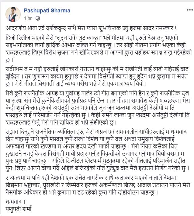 हिजो रिलीज भएको मेरो “लुट्न सके लुट कान्छा” भन्ने गीतमा यहाँ हरुले देखाउनु भएको सहभागीताको लागी हार्दिक आभार ब्यक्त गर्न चाहन्छु । तर सोही गीतमा प्रयोग भएका केही शब्दहरुलाई लिएर विरोध सृजना गर्न खोजिएकाले म आफ्नो कुरा यहाँहरु समक्ष राख्न गईरहेको छु ।सर्वप्रथम त म यहाँ हरुलाई जानकारी गराउन चाहान्छु की म राजनिती लाई त्यती गहिराई बाट बुझ्दिन । तर शुशासन कायम हुनुपर्छ र देशमा विसंगती ब्याप्त हुनु हुदैन भन्ने कुरामा म सचेत छु । मेरो गीतले बिसंगती लाई ब्यंग्य गरोस भन्ने मेरो एकमात्र ध्यय थियो।