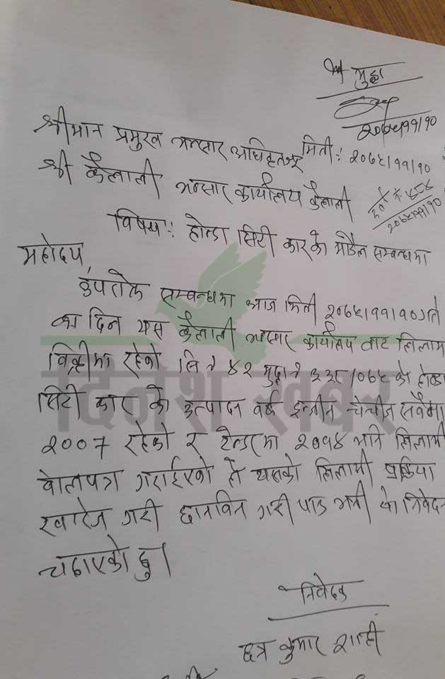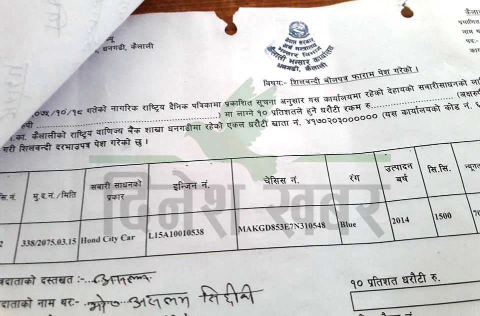 गाडीको लिलामीमा कैलाली जिल्ला भन्सार कार्यालयले चलखेल गरेको खुलासा भएको छ। बर्षाै पुराना गाडीहरुको नयाँ उत्पादन बर्ष राखेर लिलामीको सुचना जारी गरेपछि भन्सार कार्यालयले चलखेल गरेको आरोप लागेको हो। २१ दिन अगाडी गाडी लिलामीका लागि सुचना जारी गरिएकोमा आज बोलपत्र खोलिदै छ। कार, जिप र मोटरसाईकल गरि १ सय ८ वटा गाडी लिलाम गर्न सुचना जारी भएकोमा ५ सय ८१ जनाले शिलबन्दी बालपत्र फाराम पेश गरका छन्। तर बोलपत्रको सुचनामा पुराना गाडीहरुको पनि नयाँ उत्पादन बर्ष राखिएको भेटिएपछि लिलामी प्रक्रिया नै खारेजीको माग गरिएको छ। भन्सार कार्यालय कैलालीले २००७ उत्पादन बर्ष भएको होन्डा सिटि कारको २०१४ उत्पादन बर्ष भनेर सुचना जारी गरेको थियो। सेन्ट्रो कारको २००८ उत्पादन बर्ष भएकोमा २०१२ राखिएको छ भने सुजुकी कारको २००६ उत्पादन बर्ष भएकोमा २०१२ राखिएको छ।