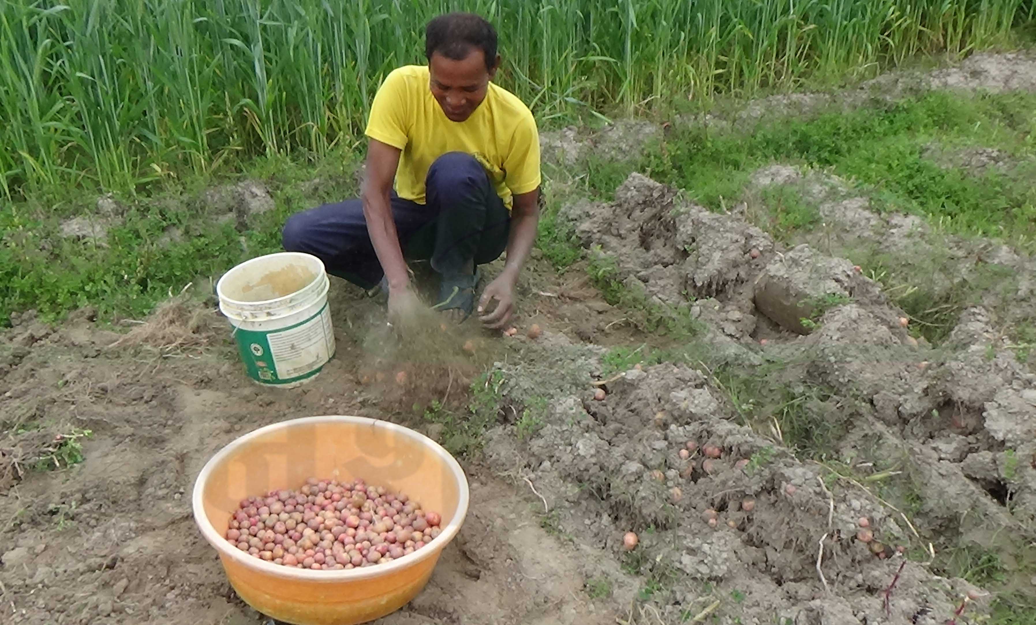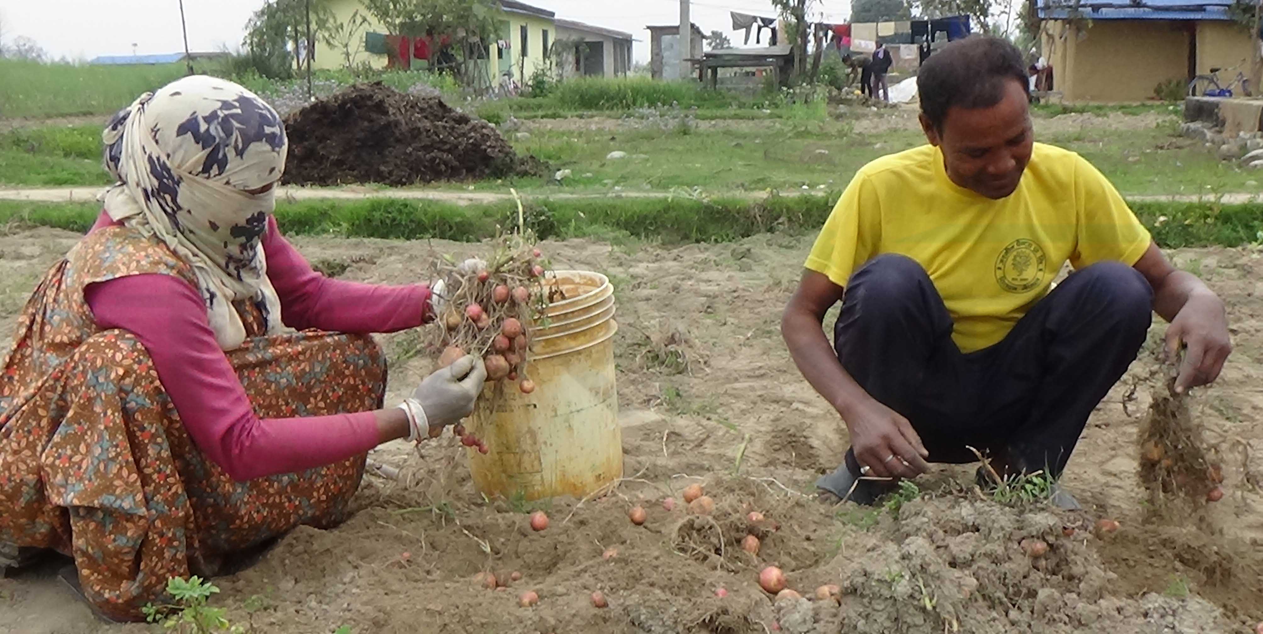 तस्बिरमा देखिएको दृष्य धनगढी उप–महानगरपालिका वडा नम्बर ८ को धनगढी गाउँको हो। त्यो दृष्यले एकछिन हाम्रो ध्यान पनि तान्यो। शनिबार दिउँसोको कुरा हो, त्यहाँ पुग्दा रतिराम चौधरी र उनकी श्रीमती रामदासी बारीमा आलु खन्दै थिए। आलुका जरा उखेल्दै छाट्दै छेउमै राखिएका प्लाष्टिकको बाल्टी र बाटामा जम्मा गर्नमा चौधरी दम्पत्ती व्यस्त देखिन्थ्यो। चौधरी दम्पत्तीको व्यस्तताका बीच हामीले कुराकानी गर्ने अनुमती माग्यौँ। दुवैजना खुसि हुदै एकछिन हामीसँग गफिए।