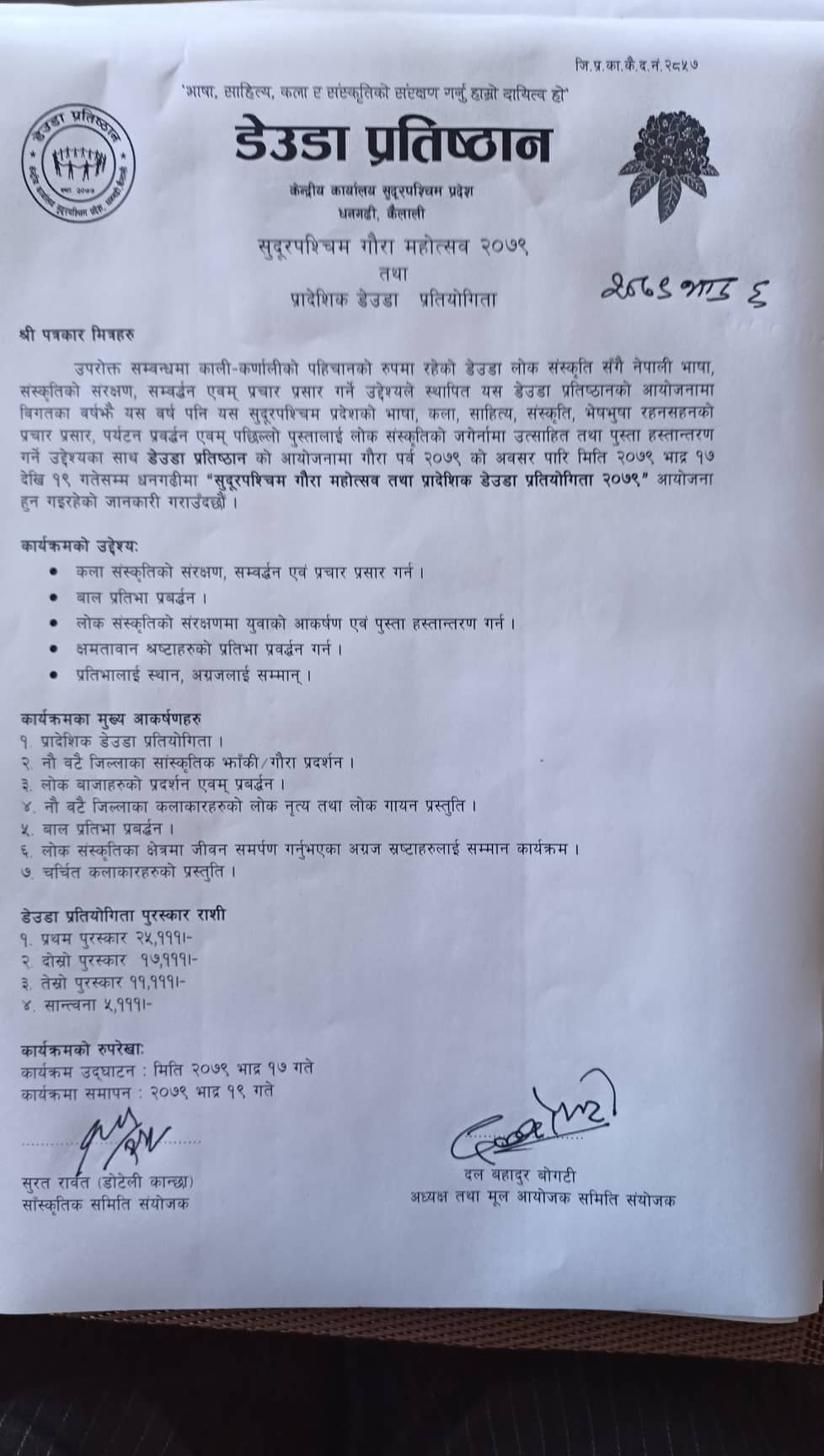 प्रतिष्ठानका अध्यक्ष तथा मूल आयोजक समितिका संयोजक दलबहादुर बोगटीका अनुसार कला संस्कृतिको सम्वद्धन तथा प्रचारप्रसार गर्नका लागि धनगढीमा गौरा महोत्सव र डेउडा प्रतियोगिता गर्न लागिएको हो।