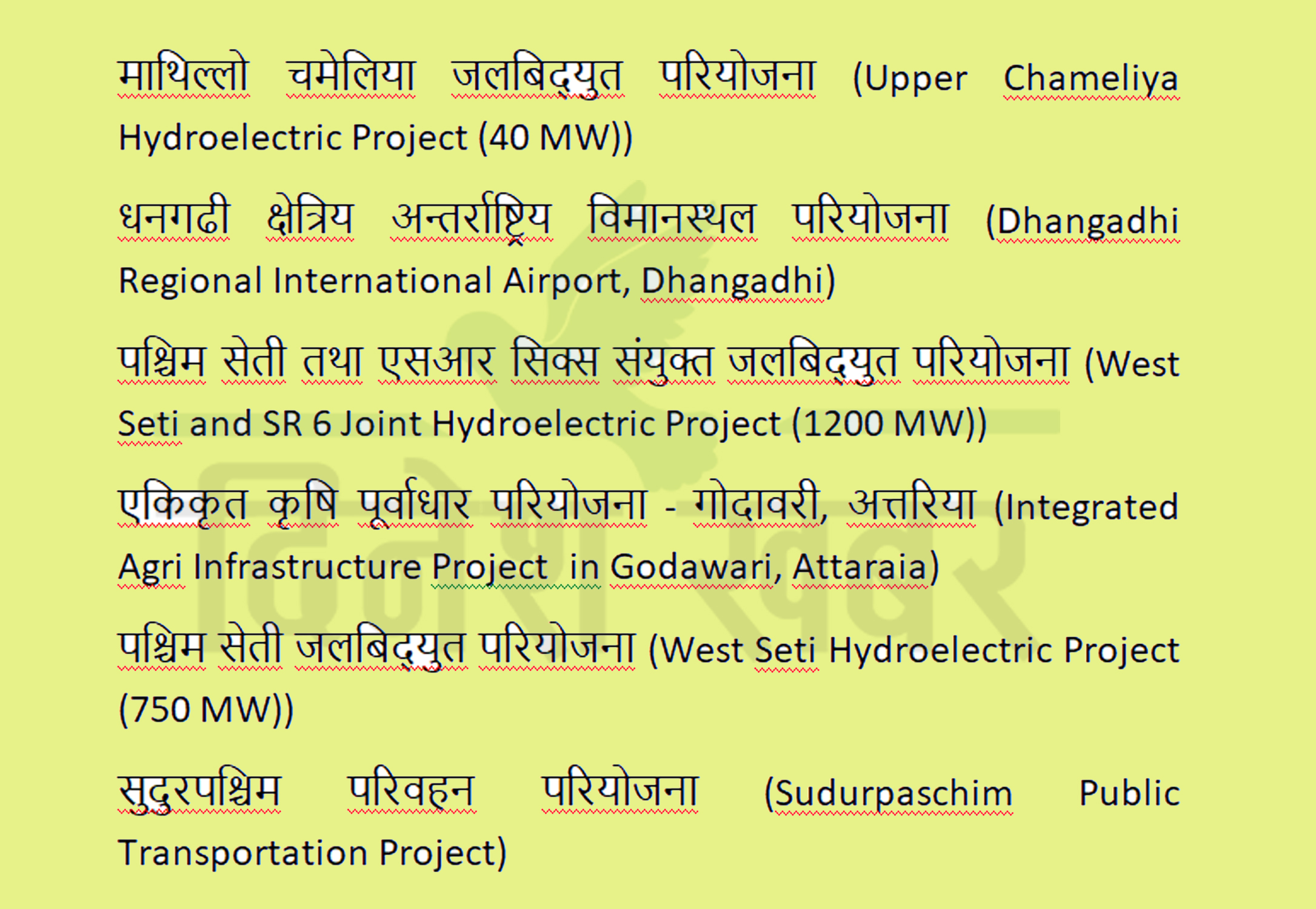 उनका अनुसार आर्थिक समृद्धिको अभियानलाई अझै सन्तुलित बनाउने गरी सरकारले आयोजना गर्न लागेको लगानी सम्मेलनमा सुदूरपपश्चमबाट ६ वटा विकास आयोजनाको प्रस्ताव सूची तयार पारिएको हो। ४० मेघावाटको माथिल्लो चमेलिया जलविद्युत आयोजना, ७ सय ५० मेघावाटको पश्चिम सेती जलविद्युत आयोजना, १२ सय मेघावाटको पश्चिम सेती तथा एसआर सिक्स संयुक्त जलबिद्युत परियोजना, धनगढी क्षेत्रिय अन्तराष्ट्रिय विमानस्थल, एकिकृत कृषि पुर्वाधार परियोजना गोदावरी कैलाली र सुदूरपश्चिम परिवहन परियोजना गरि ६ वटा परियोजना लगानी सम्मेलनमा समावेश गरिने प्रवक्ता रिजालले बताए। ६ वटै परियोजनाका लागि ४ खर्व ५४ अर्व बढि लगानी आह्वान गरिने उनले बताए।