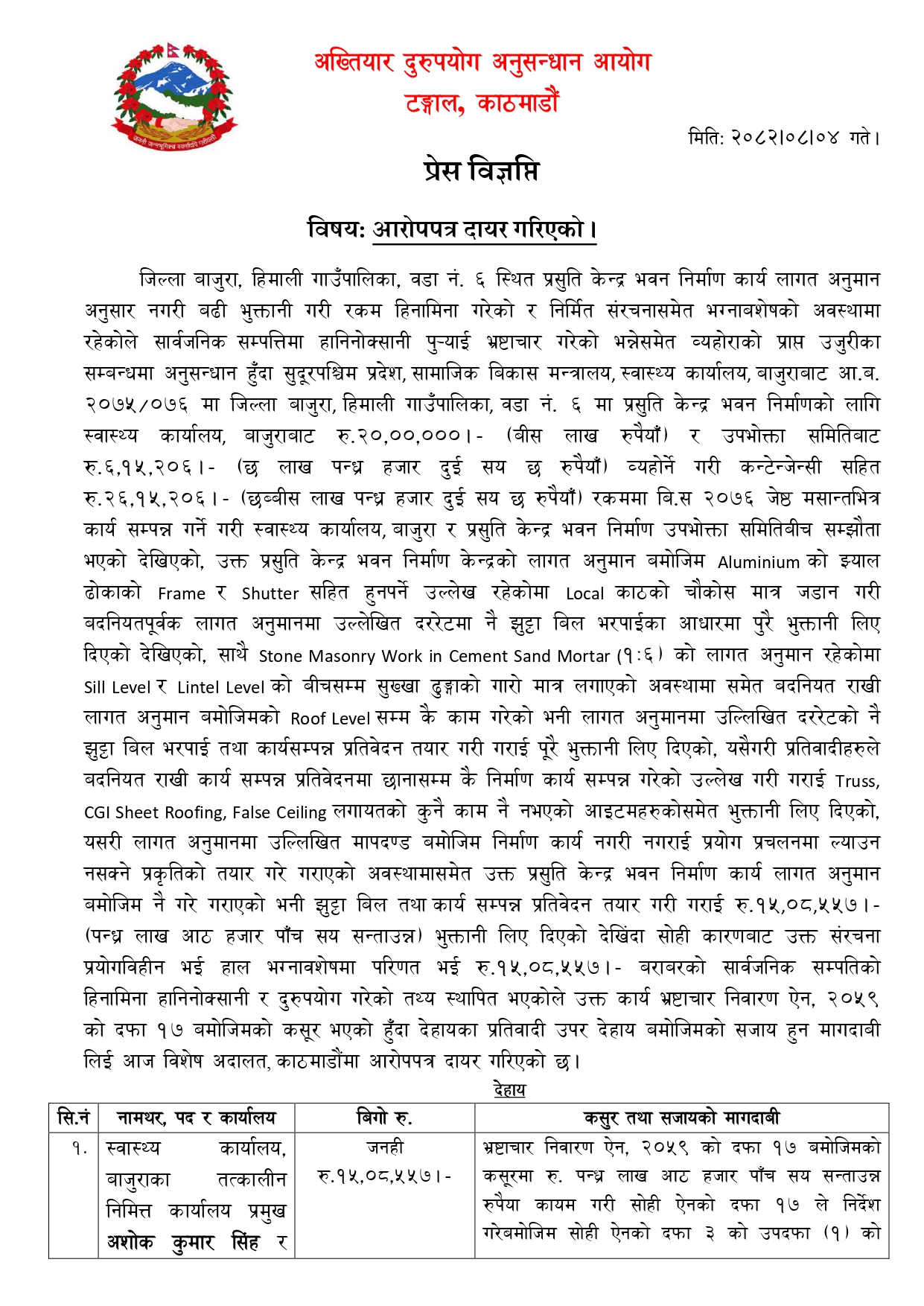 The Commission for the Investigation of Abuse of Authority (CIAA) has filed the case at the Special Court against six people, including Ashok Kumar Singh, the then acting chief of the Health Office Bajura. According to a press release, the CIAA lodged the case on Thursday, accusing them of financial irregularities in the construction of a maternity center building in Himali Rural Municipality Ward No. 6.