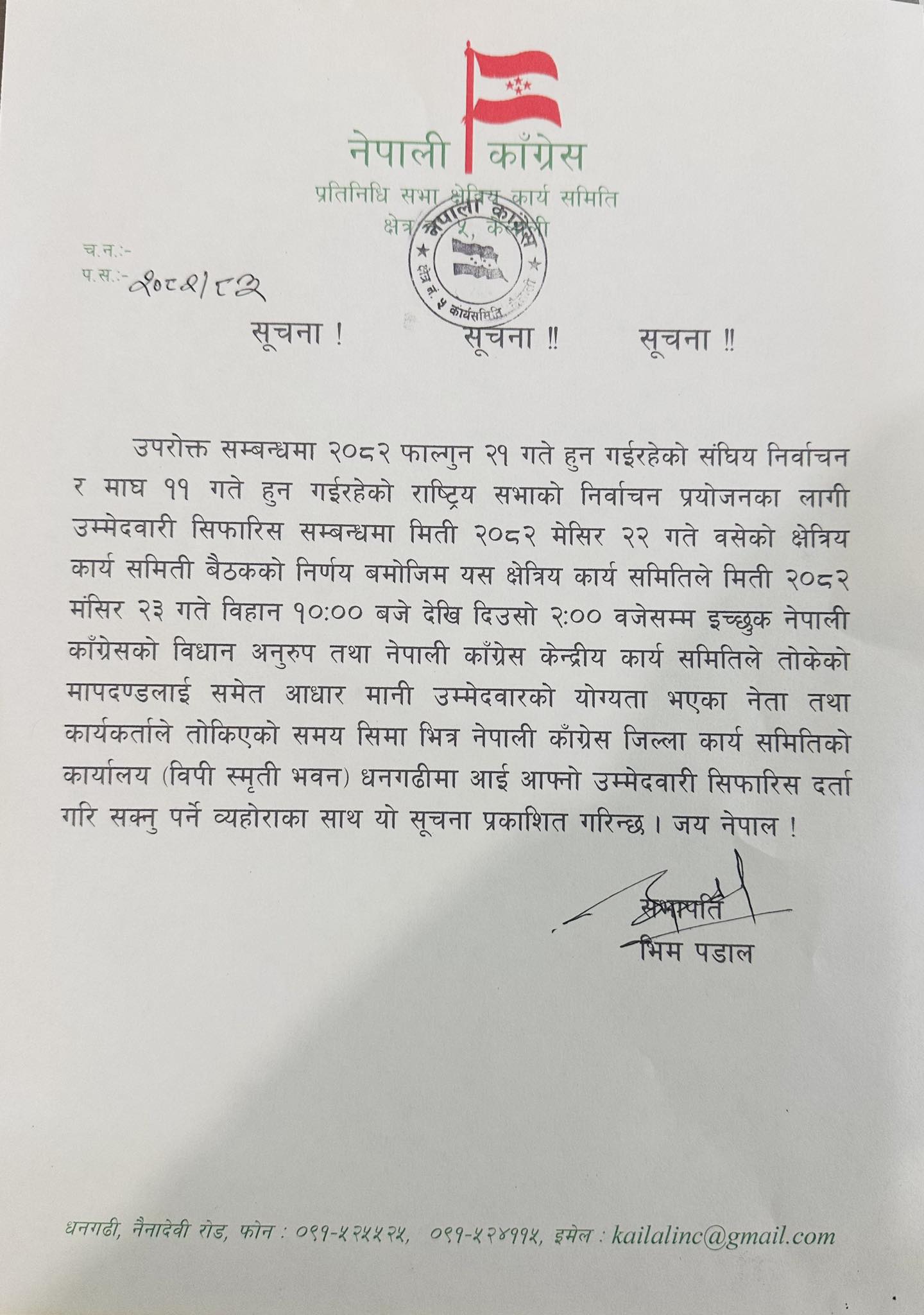 उनका अनुसार, काँग्रेसको विधान र केन्द्रीय कार्यसमितिले तोकेको मापदण्डअनुसार योग्यता भएका इच्छुकले तोकिएको समयसीमाभित्र काँग्रेस जिल्ला कार्यसमितिको कार्यालय, धनगढीमा उपस्थित भई आफ्नो उम्मेदवारी सिफारिस दर्ता गर्न सक्ने सूचनामा उल्लेख गरिएको छ।