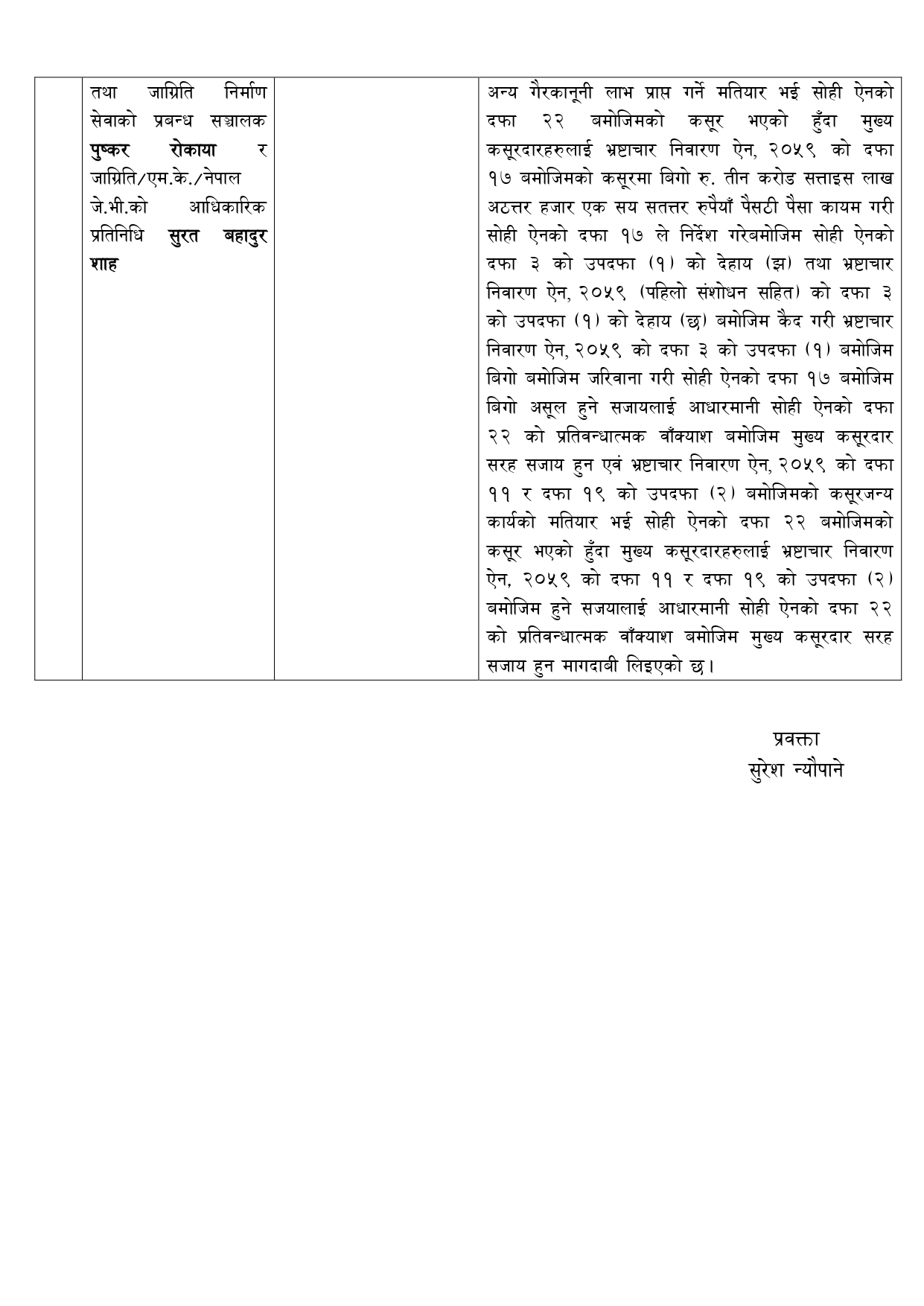 यस प्रकरणमा अख्तियारले धनगढीस्थित जागृति/एमके/नेपाल जेभी, उक्त जेभीका प्रबन्ध सञ्चालक पुष्कर रोकाया र आधिकारिक प्रतिनिधि सुरतबहादुर शाहविरुद्ध पनि कैद र बिगो मागदाबी गरेको छ ।