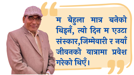 हुन त मैले विवाह प्रसङ्गलाई यस लेखमा उल्लेख गर्न खाेजेकाे हुँ । तर कहाँबाट कसरी सुरु गर्ने ? केही अडकल आइरहेकाे छैन...। जे पाे हाेला बिषय प्रवेशगर्ने अनुमति मागे है । कुरा वि. सं. २०४६ साल मंसिर १७ गते बिहिवारकाे हाे । त्याे दिन मेराे लागि एक नाैलाे अनुभव, बचपनबाट जवानी अवस्थामा प्रवेश गरेकाे स्वर्णिम युग थियाे कि भन्ने लागिरहेकाे छ ।